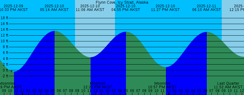 2025-12-09 09:29 PM AKST Moonrise 2025-12-09 10:33 PM AKST -0.47 feet Low Tide 2025-12-10 05:14 AM AKST 13.54 feet High Tide 2025-12-10 08:38 AM AKST Sunrise 2025-12-10 11:06 AM AKST 4.48 feet Low Tide 2025-12-10 12:20 PM AKST Moonset 2025-12-10 03:11 PM AKST Sunset 2025-12-10 04:55 PM AKST 13.27 feet High Tide 2025-12-10 10:57 PM AKST Moonrise 2025-12-10 11:27 PM AKST 1.06 feet Low Tide 2025-12-11 06:10 AM AKST 13.21 feet High Tide 2025-12-11 08:40 AM AKST Sunrise 2025-12-11 11:52 AM AKST Last Quarter 2025-12-11 12:15 PM AKST 4.63 feet Low Tide 2025-12-11 12:22 PM AKST Moonset 2025-12-11 03:11 PM AKST Sunset 2025-12-11 06:03 PM AKST 11.78 feet High Tide 2025-12-12 12:21 AM AKST Moonrise 2025-12-12 12:25 AM AKST 2.49 feet Low Tide 2025-12-12 07:07 AM AKST 13.12 feet High Tide 2025-12-12 08:41 AM AKST Sunrise 2025-12-12 12:24 PM AKST Moonset 2025-12-12 01:28 PM AKST 4.33 feet Low Tide 2025-12-12 03:11 PM AKST Sunset 2025-12-12 07:20 PM AKST 10.79 feet High Tide 2025-12-13 01:26 AM AKST 3.67 feet Low Tide 2025-12-13 01:42 AM AKST Moonrise 2025-12-13 08:01 AM AKST 13.27 feet High Tide 2025-12-13 08:42 AM AKST Sunrise 2025-12-13 12:26 PM AKST Moonset 2025-12-13 02:36 PM AKST 3.61 feet Low Tide 2025-12-13 03:11 PM AKST Sunset 2025-12-13 08:38 PM AKST 10.49 feet High Tide |