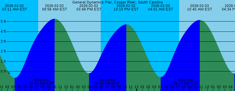 2026-02-02 03:11 AM EST -0.64 feet Low Tide 2026-02-02 07:14 AM EST Sunrise 2026-02-02 07:48 AM EST Moonset 2026-02-02 09:58 AM EST 5.28 feet High Tide 2026-02-02 03:49 PM EST -0.18 feet Low Tide 2026-02-02 05:52 PM EST Sunset 2026-02-02 06:55 PM EST Moonrise 2026-02-02 10:10 PM EST 4.72 feet High Tide 2026-02-03 04:01 AM EST -0.57 feet Low Tide 2026-02-03 07:13 AM EST Sunrise 2026-02-03 08:19 AM EST Moonset 2026-02-03 10:40 AM EST 5.16 feet High Tide 2026-02-03 04:34 PM EST -0.20 feet Low Tide 2026-02-03 05:53 PM EST Sunset 2026-02-03 07:59 PM EST Moonrise 2026-02-03 10:57 PM EST 4.75 feet High Tide 2026-02-04 04:48 AM EST -0.42 feet Low Tide 2026-02-04 07:12 AM EST Sunrise 2026-02-04 08:48 AM EST Moonset 2026-02-04 11:18 AM EST 4.94 feet High Tide 2026-02-04 05:17 PM EST -0.17 feet Low Tide 2026-02-04 05:54 PM EST Sunset 2026-02-04 09:01 PM EST Moonrise 2026-02-04 11:41 PM EST 4.69 feet High Tide 2026-02-05 05:35 AM EST -0.22 feet Low Tide 2026-02-05 07:11 AM EST Sunrise 2026-02-05 09:14 AM EST Moonset 2026-02-05 11:54 AM EST 4.66 feet High Tide 2026-02-05 05:55 PM EST Sunset 2026-02-05 05:58 PM EST -0.10 feet Low Tide 2026-02-05 10:01 PM EST Moonrise 2026-02-06 12:25 AM EST 4.57 feet High Tide |
