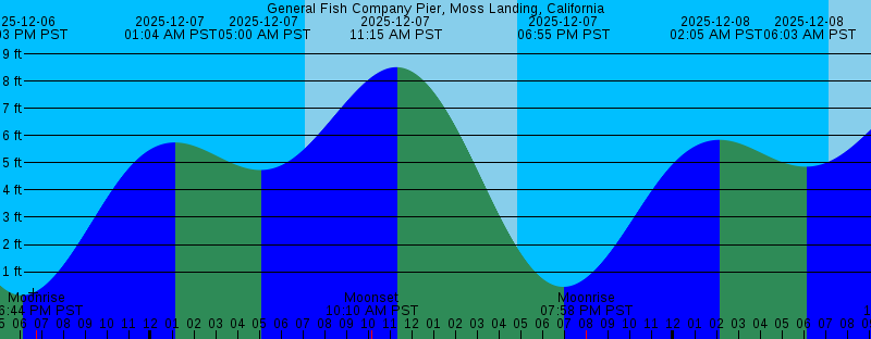 2025-12-06 06:03 PM PST 0.13 feet Low Tide 2025-12-06 06:44 PM PST Moonrise 2025-12-07 01:04 AM PST 5.75 feet High Tide 2025-12-07 05:00 AM PST 4.74 feet Low Tide 2025-12-07 07:06 AM PST Sunrise 2025-12-07 10:10 AM PST Moonset 2025-12-07 11:15 AM PST 8.52 feet High Tide 2025-12-07 04:50 PM PST Sunset 2025-12-07 06:55 PM PST 0.44 feet Low Tide 2025-12-07 07:58 PM PST Moonrise 2025-12-08 02:05 AM PST 5.85 feet High Tide 2025-12-08 06:03 AM PST 4.86 feet Low Tide 2025-12-08 07:07 AM PST Sunrise 2025-12-08 10:51 AM PST Moonset 2025-12-08 12:08 PM PST 7.95 feet High Tide 2025-12-08 04:50 PM PST Sunset 2025-12-08 07:48 PM PST 0.88 feet Low Tide 2025-12-08 09:11 PM PST Moonrise 2025-12-09 03:02 AM PST 6.02 feet High Tide 2025-12-09 07:08 AM PST Sunrise 2025-12-09 07:21 AM PST 4.92 feet Low Tide 2025-12-09 11:23 AM PST Moonset 2025-12-09 01:08 PM PST 7.26 feet High Tide 2025-12-09 04:50 PM PST Sunset 2025-12-09 08:40 PM PST 1.39 feet Low Tide 2025-12-09 10:19 PM PST Moonrise 2025-12-10 03:53 AM PST 6.26 feet High Tide 2025-12-10 07:09 AM PST Sunrise 2025-12-10 08:54 AM PST 4.81 feet Low Tide 2025-12-10 11:51 AM PST Moonset 2025-12-10 02:14 PM PST 6.53 feet High Tide 2025-12-10 04:50 PM PST Sunset |