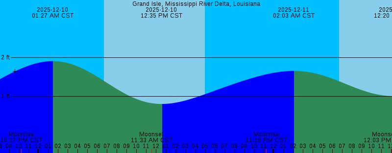 2025-12-09 10:17 PM CST Moonrise 2025-12-10 01:27 AM CST 1.90 feet High Tide 2025-12-10 06:43 AM CST Sunrise 2025-12-10 11:33 AM CST Moonset 2025-12-10 12:35 PM CST 0.80 feet Low Tide 2025-12-10 05:02 PM CST Sunset 2025-12-10 11:16 PM CST Moonrise 2025-12-11 02:03 AM CST 1.65 feet High Tide 2025-12-11 06:44 AM CST Sunrise 2025-12-11 12:03 PM CST Moonset 2025-12-11 12:20 PM CST 1.00 feet Low Tide 2025-12-11 02:52 PM CST Last Quarter 2025-12-11 05:02 PM CST Sunset 2025-12-12 12:12 AM CST Moonrise 2025-12-12 01:42 AM CST 1.40 feet High Tide 2025-12-12 06:44 AM CST Sunrise 2025-12-12 11:03 AM CST 1.14 feet Low Tide 2025-12-12 12:30 PM CST Moonset 2025-12-12 05:02 PM CST Sunset 2025-12-12 07:05 PM CST 1.41 feet High Tide 2025-12-13 01:07 AM CST Moonrise 2025-12-13 06:45 AM CST Sunrise 2025-12-13 07:27 AM CST 1.11 feet Low Tide 2025-12-13 12:57 PM CST Moonset 2025-12-13 05:03 PM CST Sunset 2025-12-13 06:27 PM CST 1.58 feet High Tide |