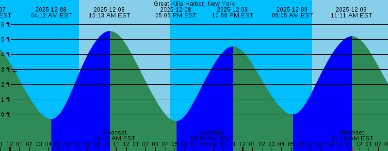 2025-12-07 04:14 PM EST -0.64 feet Low Tide 2025-12-07 04:29 PM EST Sunset 2025-12-07 07:26 PM EST Moonrise 2025-12-07 09:57 PM EST 4.66 feet High Tide 2025-12-08 04:12 AM EST -0.29 feet Low Tide 2025-12-08 07:07 AM EST Sunrise 2025-12-08 10:13 AM EST 5.56 feet High Tide 2025-12-08 10:45 AM EST Moonset 2025-12-08 04:29 PM EST Sunset 2025-12-08 05:05 PM EST -0.42 feet Low Tide 2025-12-08 08:42 PM EST Moonrise 2025-12-08 10:56 PM EST 4.54 feet High Tide 2025-12-09 05:05 AM EST 0.02 feet Low Tide 2025-12-09 07:08 AM EST Sunrise 2025-12-09 11:11 AM EST 5.22 feet High Tide 2025-12-09 11:16 AM EST Moonset 2025-12-09 04:29 PM EST Sunset 2025-12-09 05:58 PM EST -0.16 feet Low Tide 2025-12-09 09:53 PM EST Moonrise 2025-12-09 11:55 PM EST 4.45 feet High Tide 2025-12-10 06:02 AM EST 0.36 feet Low Tide 2025-12-10 07:09 AM EST Sunrise 2025-12-10 11:41 AM EST Moonset 2025-12-10 12:07 PM EST 4.88 feet High Tide 2025-12-10 04:29 PM EST Sunset 2025-12-10 06:54 PM EST 0.07 feet Low Tide 2025-12-10 11:01 PM EST Moonrise 2025-12-11 12:50 AM EST 4.41 feet High Tide 2025-12-11 07:05 AM EST 0.64 feet Low Tide 2025-12-11 07:10 AM EST Sunrise 2025-12-11 12:03 PM EST Moonset 2025-12-11 01:00 PM EST 4.57 feet High Tide |