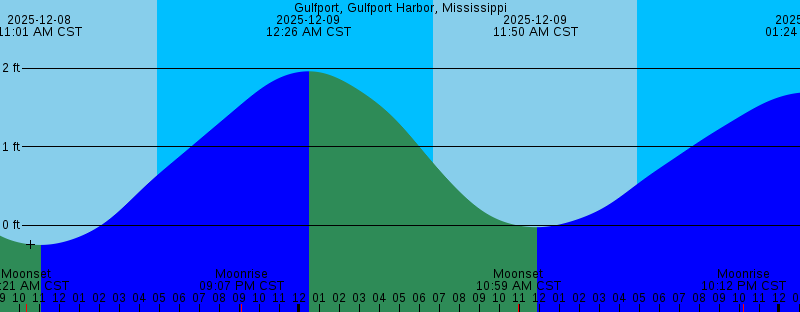 2025-12-07 07:59 PM CST Moonrise 2025-12-07 11:31 PM CST 2.18 feet High Tide 2025-12-08 06:40 AM CST Sunrise 2025-12-08 10:21 AM CST Moonset 2025-12-08 11:01 AM CST -0.25 feet Low Tide 2025-12-08 04:55 PM CST Sunset 2025-12-08 09:07 PM CST Moonrise 2025-12-09 12:26 AM CST 1.96 feet High Tide 2025-12-09 06:41 AM CST Sunrise 2025-12-09 10:59 AM CST Moonset 2025-12-09 11:50 AM CST -0.02 feet Low Tide 2025-12-09 04:55 PM CST Sunset 2025-12-09 10:12 PM CST Moonrise 2025-12-10 01:24 AM CST 1.69 feet High Tide 2025-12-10 06:42 AM CST Sunrise 2025-12-10 11:31 AM CST Moonset 2025-12-10 12:12 PM CST 0.24 feet Low Tide 2025-12-10 04:56 PM CST Sunset 2025-12-10 11:12 PM CST Moonrise 2025-12-11 02:16 AM CST 1.40 feet High Tide 2025-12-11 06:43 AM CST Sunrise 2025-12-11 11:59 AM CST Moonset 2025-12-11 12:07 PM CST 0.50 feet Low Tide 2025-12-11 02:52 PM CST Last Quarter 2025-12-11 04:56 PM CST Sunset |