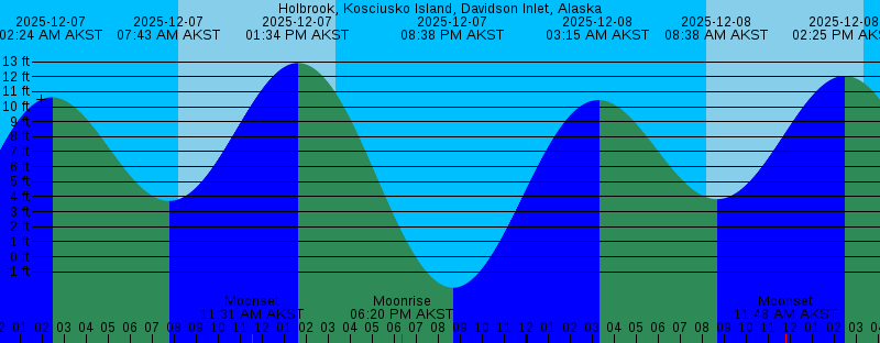 2025-12-07 02:24 AM AKST 10.62 feet High Tide 2025-12-07 07:43 AM AKST 3.72 feet Low Tide 2025-12-07 08:10 AM AKST Sunrise 2025-12-07 11:31 AM AKST Moonset 2025-12-07 01:34 PM AKST 12.91 feet High Tide 2025-12-07 03:20 PM AKST Sunset 2025-12-07 06:20 PM AKST Moonrise 2025-12-07 08:38 PM AKST -2.05 feet Low Tide 2025-12-08 03:15 AM AKST 10.44 feet High Tide 2025-12-08 08:12 AM AKST Sunrise 2025-12-08 08:38 AM AKST 3.84 feet Low Tide 2025-12-08 11:48 AM AKST Moonset 2025-12-08 02:25 PM AKST 12.05 feet High Tide 2025-12-08 03:19 PM AKST Sunset 2025-12-08 07:56 PM AKST Moonrise 2025-12-08 09:27 PM AKST -1.28 feet Low Tide 2025-12-09 04:07 AM AKST 10.24 feet High Tide 2025-12-09 08:13 AM AKST Sunrise 2025-12-09 09:38 AM AKST 3.94 feet Low Tide 2025-12-09 11:59 AM AKST Moonset 2025-12-09 03:19 PM AKST Sunset 2025-12-09 03:20 PM AKST 10.97 feet High Tide 2025-12-09 09:27 PM AKST Moonrise 2025-12-09 10:17 PM AKST -0.34 feet Low Tide 2025-12-10 05:00 AM AKST 10.09 feet High Tide 2025-12-10 08:14 AM AKST Sunrise 2025-12-10 10:45 AM AKST 3.94 feet Low Tide 2025-12-10 12:07 PM AKST Moonset 2025-12-10 03:19 PM AKST Sunset 2025-12-10 04:20 PM AKST 9.80 feet High Tide |