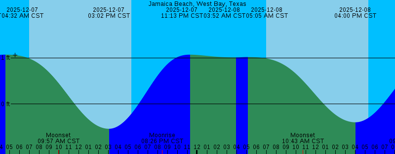 2025-12-07 03:12 AM CST 1.06 feet Low Tide 2025-12-07 04:31 AM CST 1.07 feet High Tide 2025-12-07 07:01 AM CST Sunrise 2025-12-07 09:57 AM CST Moonset 2025-12-07 03:02 PM CST -0.53 feet Low Tide 2025-12-07 05:21 PM CST Sunset 2025-12-07 08:26 PM CST Moonrise 2025-12-07 11:13 PM CST 1.07 feet High Tide 2025-12-08 03:52 AM CST 1.01 feet Low Tide 2025-12-08 05:05 AM CST 1.02 feet High Tide 2025-12-08 07:01 AM CST Sunrise 2025-12-08 10:43 AM CST Moonset 2025-12-08 04:00 PM CST -0.39 feet Low Tide 2025-12-08 05:21 PM CST Sunset 2025-12-08 09:34 PM CST Moonrise 2025-12-09 12:16 AM CST 0.98 feet High Tide 2025-12-09 07:02 AM CST Sunrise 2025-12-09 11:21 AM CST Moonset 2025-12-09 04:59 PM CST -0.22 feet Low Tide 2025-12-09 05:22 PM CST Sunset 2025-12-09 10:38 PM CST Moonrise 2025-12-10 01:02 AM CST 0.90 feet High Tide 2025-12-10 07:03 AM CST Sunrise 2025-12-10 11:54 AM CST Moonset 2025-12-10 05:22 PM CST Sunset 2025-12-10 06:03 PM CST -0.02 feet Low Tide 2025-12-10 11:37 PM CST Moonrise |