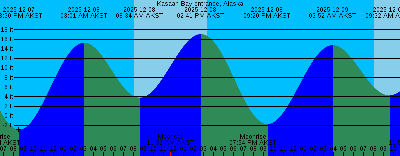 2025-12-07 11:20 AM AKST Moonset 2025-12-07 01:50 PM AKST 18.27 feet High Tide 2025-12-07 03:18 PM AKST Sunset 2025-12-07 06:19 PM AKST Moonrise 2025-12-07 08:30 PM AKST -2.88 feet Low Tide 2025-12-08 03:01 AM AKST 15.26 feet High Tide 2025-12-08 08:02 AM AKST Sunrise 2025-12-08 08:34 AM AKST 3.81 feet Low Tide 2025-12-08 11:39 AM AKST Moonset 2025-12-08 02:41 PM AKST 17.07 feet High Tide 2025-12-08 03:18 PM AKST Sunset 2025-12-08 07:54 PM AKST Moonrise 2025-12-08 09:20 PM AKST -1.72 feet Low Tide 2025-12-09 03:52 AM AKST 14.77 feet High Tide 2025-12-09 08:04 AM AKST Sunrise 2025-12-09 09:32 AM AKST 4.30 feet Low Tide 2025-12-09 11:51 AM AKST Moonset 2025-12-09 03:18 PM AKST Sunset 2025-12-09 03:35 PM AKST 15.57 feet High Tide 2025-12-09 09:24 PM AKST Moonrise 2025-12-09 10:11 PM AKST -0.36 feet Low Tide 2025-12-10 04:46 AM AKST 14.30 feet High Tide 2025-12-10 08:05 AM AKST Sunrise 2025-12-10 10:36 AM AKST 4.70 feet Low Tide 2025-12-10 12:00 PM AKST Moonset 2025-12-10 03:18 PM AKST Sunset 2025-12-10 04:34 PM AKST 13.97 feet High Tide 2025-12-10 10:47 PM AKST Moonrise 2025-12-10 11:05 PM AKST 1.06 feet Low Tide 2025-12-11 05:43 AM AKST 13.99 feet High Tide 2025-12-11 08:06 AM AKST Sunrise |
