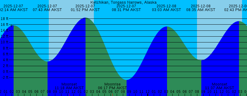 2025-12-07 02:14 AM AKST 15.75 feet High Tide 2025-12-07 07:43 AM AKST 3.49 feet Low Tide 2025-12-07 07:58 AM AKST Sunrise 2025-12-07 11:18 AM AKST Moonset 2025-12-07 01:52 PM AKST 18.37 feet High Tide 2025-12-07 03:17 PM AKST Sunset 2025-12-07 06:17 PM AKST Moonrise 2025-12-07 08:31 PM AKST -2.78 feet Low Tide 2025-12-08 03:03 AM AKST 15.36 feet High Tide 2025-12-08 08:00 AM AKST Sunrise 2025-12-08 08:35 AM AKST 3.91 feet Low Tide 2025-12-08 11:37 AM AKST Moonset 2025-12-08 02:43 PM AKST 17.17 feet High Tide 2025-12-08 03:16 PM AKST Sunset 2025-12-08 07:52 PM AKST Moonrise 2025-12-08 09:21 PM AKST -1.62 feet Low Tide 2025-12-09 03:54 AM AKST 14.87 feet High Tide 2025-12-09 08:01 AM AKST Sunrise 2025-12-09 09:33 AM AKST 4.40 feet Low Tide 2025-12-09 11:49 AM AKST Moonset 2025-12-09 03:16 PM AKST Sunset 2025-12-09 03:37 PM AKST 15.67 feet High Tide 2025-12-09 09:21 PM AKST Moonrise 2025-12-09 10:12 PM AKST -0.26 feet Low Tide 2025-12-10 04:48 AM AKST 14.40 feet High Tide 2025-12-10 08:02 AM AKST Sunrise 2025-12-10 10:37 AM AKST 4.80 feet Low Tide 2025-12-10 11:58 AM AKST Moonset 2025-12-10 03:16 PM AKST Sunset 2025-12-10 04:36 PM AKST 14.07 feet High Tide |