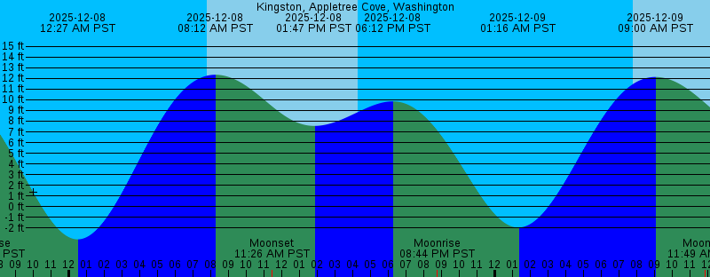 2025-12-07 10:55 AM PST Moonset 2025-12-07 12:44 PM PST 7.99 feet Low Tide 2025-12-07 04:17 PM PST Sunset 2025-12-07 05:13 PM PST 10.66 feet High Tide 2025-12-07 07:21 PM PST Moonrise 2025-12-08 12:27 AM PST -3.06 feet Low Tide 2025-12-08 07:46 AM PST Sunrise 2025-12-08 08:12 AM PST 12.35 feet High Tide 2025-12-08 11:26 AM PST Moonset 2025-12-08 01:47 PM PST 7.56 feet Low Tide 2025-12-08 04:17 PM PST Sunset 2025-12-08 06:12 PM PST 9.85 feet High Tide 2025-12-08 08:44 PM PST Moonrise 2025-12-09 01:16 AM PST -1.96 feet Low Tide 2025-12-09 07:47 AM PST Sunrise 2025-12-09 09:00 AM PST 12.14 feet High Tide 2025-12-09 11:49 AM PST Moonset 2025-12-09 02:56 PM PST 6.89 feet Low Tide 2025-12-09 04:17 PM PST Sunset 2025-12-09 07:18 PM PST 8.93 feet High Tide 2025-12-09 10:02 PM PST Moonrise 2025-12-10 02:07 AM PST -0.55 feet Low Tide 2025-12-10 07:48 AM PST Sunrise 2025-12-10 09:45 AM PST 11.92 feet High Tide 2025-12-10 12:07 PM PST Moonset 2025-12-10 04:08 PM PST 5.96 feet Low Tide 2025-12-10 04:17 PM PST Sunset 2025-12-10 08:34 PM PST 8.02 feet High Tide 2025-12-10 11:16 PM PST Moonrise 2025-12-11 02:59 AM PST 1.08 feet Low Tide 2025-12-11 07:49 AM PST Sunrise 2025-12-11 10:27 AM PST 11.71 feet High Tide |