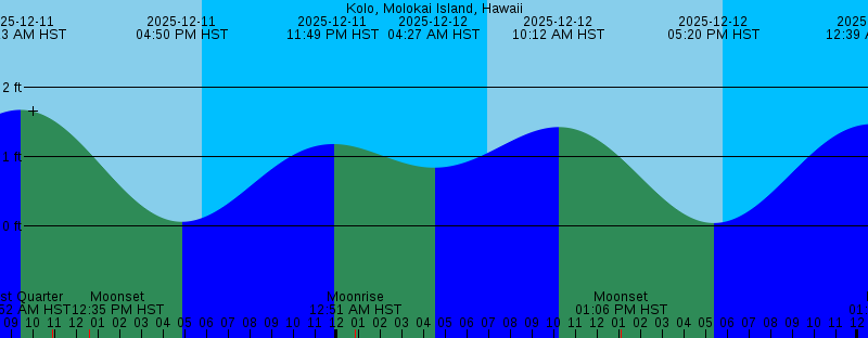 2025-12-11 10:52 AM HST Last Quarter 2025-12-11 12:35 PM HST Moonset 2025-12-11 04:50 PM HST 0.06 feet Low Tide 2025-12-11 05:48 PM HST Sunset 2025-12-11 11:49 PM HST 1.18 feet High Tide 2025-12-12 12:51 AM HST Moonrise 2025-12-12 04:27 AM HST 0.84 feet Low Tide 2025-12-12 06:56 AM HST Sunrise 2025-12-12 10:12 AM HST 1.43 feet High Tide 2025-12-12 01:06 PM HST Moonset 2025-12-12 05:20 PM HST 0.04 feet Low Tide 2025-12-12 05:48 PM HST Sunset 2025-12-13 12:39 AM HST 1.47 feet High Tide 2025-12-13 01:41 AM HST Moonrise 2025-12-13 06:18 AM HST 0.85 feet Low Tide 2025-12-13 06:57 AM HST Sunrise 2025-12-13 11:00 AM HST 1.20 feet High Tide 2025-12-13 01:37 PM HST Moonset 2025-12-13 05:48 PM HST 0.02 feet Low Tide 2025-12-13 05:49 PM HST Sunset 2025-12-14 01:18 AM HST 1.73 feet High Tide 2025-12-14 02:31 AM HST Moonrise 2025-12-14 06:57 AM HST Sunrise 2025-12-14 07:46 AM HST 0.75 feet Low Tide 2025-12-14 11:50 AM HST 1.00 feet High Tide 2025-12-14 02:09 PM HST Moonset 2025-12-14 05:49 PM HST Sunset 2025-12-14 06:13 PM HST -0.00 feet Low Tide 2025-12-15 01:52 AM HST 1.95 feet High Tide 2025-12-15 03:22 AM HST Moonrise 2025-12-15 06:58 AM HST Sunrise 2025-12-15 08:50 AM HST 0.62 feet Low Tide |