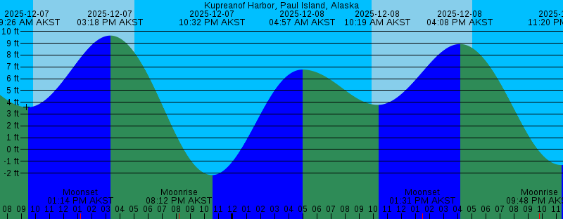 2025-12-07 04:07 AM AKST 6.87 feet High Tide 2025-12-07 09:26 AM AKST 3.58 feet Low Tide 2025-12-07 09:52 AM AKST Sunrise 2025-12-07 01:14 PM AKST Moonset 2025-12-07 03:18 PM AKST 9.65 feet High Tide 2025-12-07 05:05 PM AKST Sunset 2025-12-07 08:12 PM AKST Moonrise 2025-12-07 10:32 PM AKST -2.17 feet Low Tide 2025-12-08 04:57 AM AKST 6.77 feet High Tide 2025-12-08 09:54 AM AKST Sunrise 2025-12-08 10:19 AM AKST 3.78 feet Low Tide 2025-12-08 01:31 PM AKST Moonset 2025-12-08 04:08 PM AKST 8.93 feet High Tide 2025-12-08 05:04 PM AKST Sunset 2025-12-08 09:48 PM AKST Moonrise 2025-12-08 11:20 PM AKST -1.32 feet Low Tide 2025-12-09 05:49 AM AKST 6.67 feet High Tide 2025-12-09 09:55 AM AKST Sunrise 2025-12-09 11:17 AM AKST 4.01 feet Low Tide 2025-12-09 01:42 PM AKST Moonset 2025-12-09 05:02 PM AKST 8.03 feet High Tide 2025-12-09 05:04 PM AKST Sunset 2025-12-09 11:18 PM AKST Moonrise 2025-12-10 12:09 AM AKST -0.32 feet Low Tide 2025-12-10 06:42 AM AKST 6.63 feet High Tide 2025-12-10 09:56 AM AKST Sunrise 2025-12-10 12:22 PM AKST 4.18 feet Low Tide 2025-12-10 01:50 PM AKST Moonset 2025-12-10 05:04 PM AKST Sunset 2025-12-10 05:59 PM AKST 7.06 feet High Tide 2025-12-11 12:41 AM AKST Moonrise 2025-12-11 12:59 AM AKST 0.74 feet Low Tide |