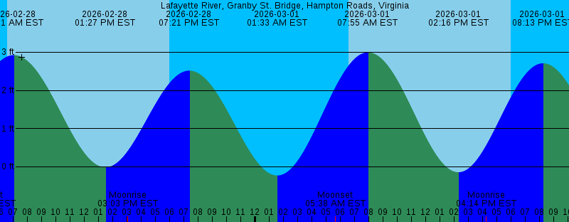 2026-02-28 01:28 PM EST -0.01 feet Low Tide 2026-02-28 03:03 PM EST Moonrise 2026-02-28 05:58 PM EST Sunset 2026-02-28 07:21 PM EST 2.52 feet High Tide 2026-03-01 01:33 AM EST -0.23 feet Low Tide 2026-03-01 05:38 AM EST Moonset 2026-03-01 06:35 AM EST Sunrise 2026-03-01 07:55 AM EST 3.00 feet High Tide 2026-03-01 02:16 PM EST -0.14 feet Low Tide 2026-03-01 04:14 PM EST Moonrise 2026-03-01 05:59 PM EST Sunset 2026-03-01 08:13 PM EST 2.71 feet High Tide 2026-03-02 02:26 AM EST -0.31 feet Low Tide 2026-03-02 06:08 AM EST Moonset 2026-03-02 06:34 AM EST Sunrise 2026-03-02 08:43 AM EST 3.02 feet High Tide 2026-03-02 03:01 PM EST -0.23 feet Low Tide 2026-03-02 05:22 PM EST Moonrise 2026-03-02 06:00 PM EST Sunset 2026-03-02 09:00 PM EST 2.87 feet High Tide 2026-03-03 03:15 AM EST -0.35 feet Low Tide 2026-03-03 06:33 AM EST Sunrise 2026-03-03 06:35 AM EST Moonset 2026-03-03 06:39 AM EST Full Moon 2026-03-03 09:26 AM EST 2.98 feet High Tide 2026-03-03 03:41 PM EST -0.27 feet Low Tide 2026-03-03 06:01 PM EST Sunset 2026-03-03 06:28 PM EST Moonrise 2026-03-03 09:43 PM EST 2.97 feet High Tide 2026-03-04 04:01 AM EST -0.33 feet Low Tide 2026-03-04 06:31 AM EST Sunrise 2026-03-04 06:59 AM EST Moonset |