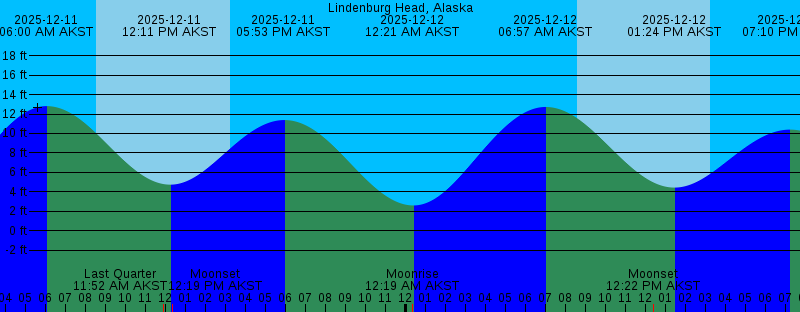 2025-12-09 09:29 PM AKST Moonrise 2025-12-09 10:29 PM AKST -0.37 feet Low Tide 2025-12-10 05:04 AM AKST 13.14 feet High Tide 2025-12-10 08:30 AM AKST Sunrise 2025-12-10 11:02 AM AKST 4.58 feet Low Tide 2025-12-10 12:16 PM AKST Moonset 2025-12-10 03:15 PM AKST Sunset 2025-12-10 04:45 PM AKST 12.87 feet High Tide 2025-12-10 10:56 PM AKST Moonrise 2025-12-10 11:23 PM AKST 1.16 feet Low Tide 2025-12-11 06:00 AM AKST 12.81 feet High Tide 2025-12-11 08:31 AM AKST Sunrise 2025-12-11 11:52 AM AKST Last Quarter 2025-12-11 12:11 PM AKST 4.73 feet Low Tide 2025-12-11 12:19 PM AKST Moonset 2025-12-11 03:15 PM AKST Sunset 2025-12-11 05:53 PM AKST 11.38 feet High Tide 2025-12-12 12:19 AM AKST Moonrise 2025-12-12 12:21 AM AKST 2.59 feet Low Tide 2025-12-12 06:57 AM AKST 12.72 feet High Tide 2025-12-12 08:33 AM AKST Sunrise 2025-12-12 12:22 PM AKST Moonset 2025-12-12 01:24 PM AKST 4.43 feet Low Tide 2025-12-12 03:14 PM AKST Sunset 2025-12-12 07:10 PM AKST 10.39 feet High Tide 2025-12-13 01:22 AM AKST 3.77 feet Low Tide 2025-12-13 01:39 AM AKST Moonrise 2025-12-13 07:51 AM AKST 12.87 feet High Tide 2025-12-13 08:34 AM AKST Sunrise 2025-12-13 12:25 PM AKST Moonset 2025-12-13 02:32 PM AKST 3.71 feet Low Tide 2025-12-13 03:14 PM AKST Sunset |