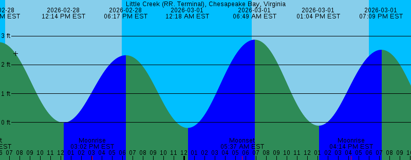 2026-02-28 06:36 AM EST Sunrise 2026-02-28 12:14 PM EST -0.01 feet Low Tide 2026-02-28 03:02 PM EST Moonrise 2026-02-28 05:58 PM EST Sunset 2026-02-28 06:17 PM EST 2.33 feet High Tide 2026-03-01 12:18 AM EST -0.19 feet Low Tide 2026-03-01 05:37 AM EST Moonset 2026-03-01 06:35 AM EST Sunrise 2026-03-01 06:49 AM EST 2.87 feet High Tide 2026-03-01 01:04 PM EST -0.11 feet Low Tide 2026-03-01 04:14 PM EST Moonrise 2026-03-01 05:59 PM EST Sunset 2026-03-01 07:09 PM EST 2.52 feet High Tide 2026-03-02 01:12 AM EST -0.26 feet Low Tide 2026-03-02 06:08 AM EST Moonset 2026-03-02 06:34 AM EST Sunrise 2026-03-02 07:37 AM EST 2.90 feet High Tide 2026-03-02 01:48 PM EST -0.18 feet Low Tide 2026-03-02 05:22 PM EST Moonrise 2026-03-02 05:59 PM EST Sunset 2026-03-02 07:55 PM EST 2.67 feet High Tide 2026-03-03 02:02 AM EST -0.29 feet Low Tide 2026-03-03 06:32 AM EST Sunrise 2026-03-03 06:34 AM EST Moonset 2026-03-03 06:39 AM EST Full Moon 2026-03-03 08:19 AM EST 2.87 feet High Tide 2026-03-03 02:29 PM EST -0.22 feet Low Tide 2026-03-03 06:00 PM EST Sunset 2026-03-03 06:27 PM EST Moonrise 2026-03-03 08:37 PM EST 2.78 feet High Tide 2026-03-04 02:47 AM EST -0.26 feet Low Tide |