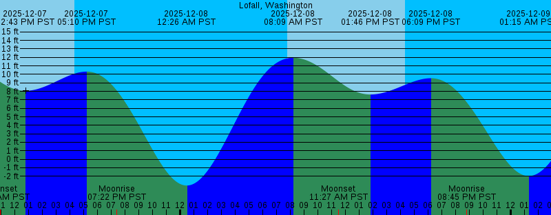 2025-12-07 07:20 AM PST 12.11 feet High Tide 2025-12-07 07:46 AM PST Sunrise 2025-12-07 10:56 AM PST Moonset 2025-12-07 12:43 PM PST 8.07 feet Low Tide 2025-12-07 04:18 PM PST Sunset 2025-12-07 05:10 PM PST 10.33 feet High Tide 2025-12-07 07:22 PM PST Moonrise 2025-12-08 12:26 AM PST -3.09 feet Low Tide 2025-12-08 07:47 AM PST Sunrise 2025-12-08 08:09 AM PST 11.96 feet High Tide 2025-12-08 11:27 AM PST Moonset 2025-12-08 01:46 PM PST 7.63 feet Low Tide 2025-12-08 04:18 PM PST Sunset 2025-12-08 06:09 PM PST 9.55 feet High Tide 2025-12-08 08:45 PM PST Moonrise 2025-12-09 01:15 AM PST -1.97 feet Low Tide 2025-12-09 07:48 AM PST Sunrise 2025-12-09 08:57 AM PST 11.76 feet High Tide 2025-12-09 11:50 AM PST Moonset 2025-12-09 02:55 PM PST 6.96 feet Low Tide 2025-12-09 04:18 PM PST Sunset 2025-12-09 07:15 PM PST 8.65 feet High Tide 2025-12-09 10:03 PM PST Moonrise 2025-12-10 02:06 AM PST -0.55 feet Low Tide 2025-12-10 07:49 AM PST Sunrise 2025-12-10 09:42 AM PST 11.55 feet High Tide 2025-12-10 12:08 PM PST Moonset 2025-12-10 04:07 PM PST 6.02 feet Low Tide 2025-12-10 04:18 PM PST Sunset 2025-12-10 08:31 PM PST 7.77 feet High Tide 2025-12-10 11:17 PM PST Moonrise 2025-12-11 02:58 AM PST 1.09 feet Low Tide |