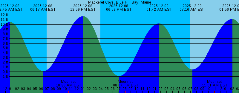 2025-12-08 12:45 AM EST 10.50 feet High Tide 2025-12-08 06:17 AM EST 0.15 feet Low Tide 2025-12-08 06:56 AM EST Sunrise 2025-12-08 10:33 AM EST Moonset 2025-12-08 12:59 PM EST 11.75 feet High Tide 2025-12-08 03:54 PM EST Sunset 2025-12-08 06:59 PM EST -0.90 feet Low Tide 2025-12-08 08:07 PM EST Moonrise 2025-12-09 01:42 AM EST 10.22 feet High Tide 2025-12-09 06:57 AM EST Sunrise 2025-12-09 07:16 AM EST 0.50 feet Low Tide 2025-12-09 11:01 AM EST Moonset 2025-12-09 01:56 PM EST 11.15 feet High Tide 2025-12-09 03:54 PM EST Sunset 2025-12-09 07:56 PM EST -0.38 feet Low Tide 2025-12-09 09:23 PM EST Moonrise 2025-12-10 02:39 AM EST 9.96 feet High Tide 2025-12-10 06:58 AM EST Sunrise 2025-12-10 08:16 AM EST 0.84 feet Low Tide 2025-12-10 11:23 AM EST Moonset 2025-12-10 02:56 PM EST 10.53 feet High Tide 2025-12-10 03:54 PM EST Sunset 2025-12-10 08:53 PM EST 0.13 feet Low Tide 2025-12-10 10:33 PM EST Moonrise 2025-12-11 03:38 AM EST 9.75 feet High Tide 2025-12-11 06:59 AM EST Sunrise 2025-12-11 09:19 AM EST 1.10 feet Low Tide 2025-12-11 11:42 AM EST Moonset 2025-12-11 03:52 PM EST Last Quarter 2025-12-11 03:54 PM EST Sunset 2025-12-11 03:57 PM EST 9.96 feet High Tide 2025-12-11 09:51 PM EST 0.58 feet Low Tide 2025-12-11 11:41 PM EST Moonrise |