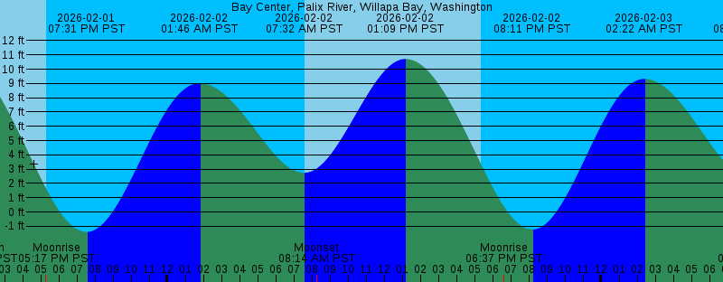 2026-02-01 05:17 PM PST Moonrise 2026-02-01 05:19 PM PST Sunset 2026-02-01 07:31 PM PST -1.40 feet Low Tide 2026-02-02 01:46 AM PST 9.02 feet High Tide 2026-02-02 07:32 AM PST 2.75 feet Low Tide 2026-02-02 07:37 AM PST Sunrise 2026-02-02 08:14 AM PST Moonset 2026-02-02 01:09 PM PST 10.72 feet High Tide 2026-02-02 05:21 PM PST Sunset 2026-02-02 06:37 PM PST Moonrise 2026-02-02 08:11 PM PST -1.23 feet Low Tide 2026-02-03 02:22 AM PST 9.32 feet High Tide 2026-02-03 07:36 AM PST Sunrise 2026-02-03 08:20 AM PST 2.31 feet Low Tide 2026-02-03 08:34 AM PST Moonset 2026-02-03 01:55 PM PST 10.30 feet High Tide 2026-02-03 05:22 PM PST Sunset 2026-02-03 07:53 PM PST Moonrise 2026-02-03 08:48 PM PST -0.78 feet Low Tide 2026-02-04 02:57 AM PST 9.52 feet High Tide 2026-02-04 07:35 AM PST Sunrise 2026-02-04 08:51 AM PST Moonset 2026-02-04 09:06 AM PST 2.02 feet Low Tide 2026-02-04 02:40 PM PST 9.69 feet High Tide 2026-02-04 05:24 PM PST Sunset 2026-02-04 09:06 PM PST Moonrise 2026-02-04 09:23 PM PST -0.10 feet Low Tide 2026-02-05 03:31 AM PST 9.62 feet High Tide 2026-02-05 07:33 AM PST Sunrise 2026-02-05 09:07 AM PST Moonset 2026-02-05 09:51 AM PST 1.88 feet Low Tide |