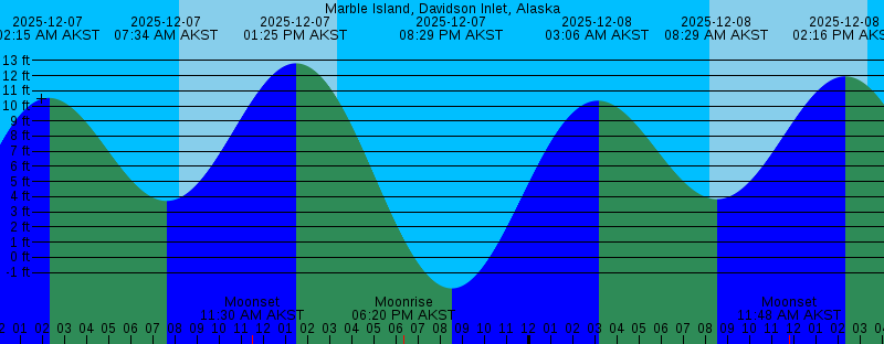 2025-12-07 02:15 AM AKST 10.52 feet High Tide 2025-12-07 07:34 AM AKST 3.72 feet Low Tide 2025-12-07 08:10 AM AKST Sunrise 2025-12-07 11:30 AM AKST Moonset 2025-12-07 01:25 PM AKST 12.81 feet High Tide 2025-12-07 03:20 PM AKST Sunset 2025-12-07 06:20 PM AKST Moonrise 2025-12-07 08:29 PM AKST -2.05 feet Low Tide 2025-12-08 03:06 AM AKST 10.34 feet High Tide 2025-12-08 08:11 AM AKST Sunrise 2025-12-08 08:29 AM AKST 3.84 feet Low Tide 2025-12-08 11:48 AM AKST Moonset 2025-12-08 02:16 PM AKST 11.95 feet High Tide 2025-12-08 03:19 PM AKST Sunset 2025-12-08 07:57 PM AKST Moonrise 2025-12-08 09:18 PM AKST -1.28 feet Low Tide 2025-12-09 03:58 AM AKST 10.14 feet High Tide 2025-12-09 08:13 AM AKST Sunrise 2025-12-09 09:29 AM AKST 3.94 feet Low Tide 2025-12-09 11:59 AM AKST Moonset 2025-12-09 03:11 PM AKST 10.87 feet High Tide 2025-12-09 03:19 PM AKST Sunset 2025-12-09 09:27 PM AKST Moonrise 2025-12-09 10:08 PM AKST -0.34 feet Low Tide 2025-12-10 04:51 AM AKST 9.99 feet High Tide 2025-12-10 08:14 AM AKST Sunrise 2025-12-10 10:36 AM AKST 3.94 feet Low Tide 2025-12-10 12:06 PM AKST Moonset 2025-12-10 03:19 PM AKST Sunset 2025-12-10 04:11 PM AKST 9.70 feet High Tide |