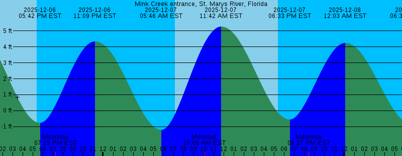 2025-12-06 05:24 PM EST Sunset 2025-12-06 05:42 PM EST -0.77 feet Low Tide 2025-12-06 07:15 PM EST Moonrise 2025-12-06 11:09 PM EST 4.34 feet High Tide 2025-12-07 05:46 AM EST -1.21 feet Low Tide 2025-12-07 07:10 AM EST Sunrise 2025-12-07 10:05 AM EST Moonset 2025-12-07 11:42 AM EST 5.28 feet High Tide 2025-12-07 05:25 PM EST Sunset 2025-12-07 06:33 PM EST -0.56 feet Low Tide 2025-12-07 08:27 PM EST Moonrise 2025-12-08 12:03 AM EST 4.25 feet High Tide 2025-12-08 06:39 AM EST -0.83 feet Low Tide 2025-12-08 07:11 AM EST Sunrise 2025-12-08 10:51 AM EST Moonset 2025-12-08 12:35 PM EST 5.03 feet High Tide 2025-12-08 05:25 PM EST Sunset 2025-12-08 07:26 PM EST -0.28 feet Low Tide 2025-12-08 09:36 PM EST Moonrise 2025-12-09 12:58 AM EST 4.14 feet High Tide 2025-12-09 07:12 AM EST Sunrise 2025-12-09 07:34 AM EST -0.35 feet Low Tide 2025-12-09 11:28 AM EST Moonset 2025-12-09 01:27 PM EST 4.74 feet High Tide 2025-12-09 05:25 PM EST Sunset 2025-12-09 08:21 PM EST -0.02 feet Low Tide 2025-12-09 10:40 PM EST Moonrise 2025-12-10 01:53 AM EST 4.03 feet High Tide 2025-12-10 07:12 AM EST Sunrise 2025-12-10 08:34 AM EST 0.13 feet Low Tide 2025-12-10 12:00 PM EST Moonset 2025-12-10 02:18 PM EST 4.43 feet High Tide |