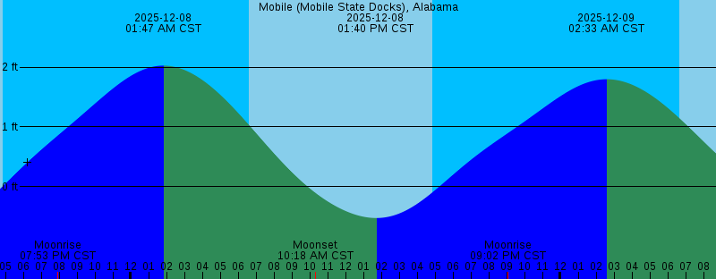 2025-12-07 09:32 AM CST Moonset 2025-12-07 12:55 PM CST -0.69 feet Low Tide 2025-12-07 04:50 PM CST Sunset 2025-12-07 07:53 PM CST Moonrise 2025-12-08 01:47 AM CST 2.03 feet High Tide 2025-12-08 06:37 AM CST Sunrise 2025-12-08 10:18 AM CST Moonset 2025-12-08 01:40 PM CST -0.52 feet Low Tide 2025-12-08 04:50 PM CST Sunset 2025-12-08 09:02 PM CST Moonrise 2025-12-09 02:33 AM CST 1.80 feet High Tide 2025-12-09 06:38 AM CST Sunrise 2025-12-09 10:55 AM CST Moonset 2025-12-09 02:10 PM CST -0.29 feet Low Tide 2025-12-09 04:50 PM CST Sunset 2025-12-09 10:07 PM CST Moonrise 2025-12-10 03:09 AM CST 1.51 feet High Tide 2025-12-10 06:39 AM CST Sunrise 2025-12-10 11:27 AM CST Moonset 2025-12-10 02:09 PM CST -0.02 feet Low Tide 2025-12-10 04:51 PM CST Sunset 2025-12-10 11:07 PM CST Moonrise 2025-12-11 03:32 AM CST 1.17 feet High Tide 2025-12-11 06:39 AM CST Sunrise |