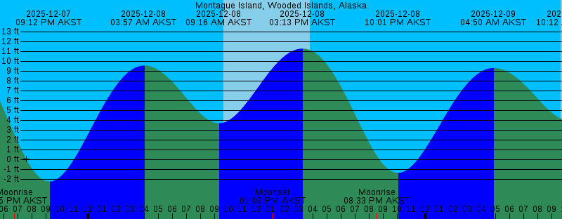 2025-12-07 09:35 AM AKST Sunrise 2025-12-07 01:03 PM AKST Moonset 2025-12-07 02:23 PM AKST 12.15 feet High Tide 2025-12-07 03:46 PM AKST Sunset 2025-12-07 06:45 PM AKST Moonrise 2025-12-07 09:12 PM AKST -2.25 feet Low Tide 2025-12-08 03:57 AM AKST 9.57 feet High Tide 2025-12-08 09:16 AM AKST 3.70 feet Low Tide 2025-12-08 09:37 AM AKST Sunrise 2025-12-08 01:09 PM AKST Moonset 2025-12-08 03:13 PM AKST 11.30 feet High Tide 2025-12-08 03:46 PM AKST Sunset 2025-12-08 08:33 PM AKST Moonrise 2025-12-08 10:01 PM AKST -1.36 feet Low Tide 2025-12-09 04:50 AM AKST 9.33 feet High Tide 2025-12-09 09:38 AM AKST Sunrise 2025-12-09 10:12 AM AKST 3.98 feet Low Tide 2025-12-09 01:11 PM AKST Moonset 2025-12-09 03:45 PM AKST Sunset 2025-12-09 04:06 PM AKST 10.22 feet High Tide 2025-12-09 10:12 PM AKST Moonrise 2025-12-09 10:50 PM AKST -0.31 feet Low Tide 2025-12-10 05:46 AM AKST 9.14 feet High Tide 2025-12-10 09:40 AM AKST Sunrise 2025-12-10 11:12 AM AKST 4.20 feet Low Tide 2025-12-10 01:11 PM AKST Moonset 2025-12-10 03:44 PM AKST Sunset 2025-12-10 05:10 PM AKST 9.06 feet High Tide 2025-12-10 11:39 PM AKST 0.83 feet Low Tide 2025-12-10 11:44 PM AKST Moonrise 2025-12-11 06:44 AM AKST 9.10 feet High Tide |