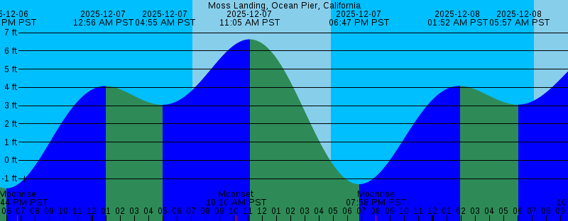 2025-12-06 05:56 PM PST -1.53 feet Low Tide 2025-12-06 06:44 PM PST Moonrise 2025-12-07 12:56 AM PST 4.07 feet High Tide 2025-12-07 04:55 AM PST 3.04 feet Low Tide 2025-12-07 07:06 AM PST Sunrise 2025-12-07 10:10 AM PST Moonset 2025-12-07 11:05 AM PST 6.63 feet High Tide 2025-12-07 04:50 PM PST Sunset 2025-12-07 06:47 PM PST -1.30 feet Low Tide 2025-12-07 07:58 PM PST Moonrise 2025-12-08 01:52 AM PST 4.08 feet High Tide 2025-12-08 05:57 AM PST 3.05 feet Low Tide 2025-12-08 07:07 AM PST Sunrise 2025-12-08 10:51 AM PST Moonset 2025-12-08 11:59 AM PST 6.09 feet High Tide 2025-12-08 04:50 PM PST Sunset 2025-12-08 07:37 PM PST -0.90 feet Low Tide 2025-12-08 09:11 PM PST Moonrise 2025-12-09 02:46 AM PST 4.18 feet High Tide 2025-12-09 07:07 AM PST 3.04 feet Low Tide 2025-12-09 07:08 AM PST Sunrise 2025-12-09 11:23 AM PST Moonset 2025-12-09 12:57 PM PST 5.40 feet High Tide 2025-12-09 04:50 PM PST Sunset 2025-12-09 08:27 PM PST -0.39 feet Low Tide 2025-12-09 10:19 PM PST Moonrise 2025-12-10 03:38 AM PST 4.38 feet High Tide 2025-12-10 07:09 AM PST Sunrise 2025-12-10 08:36 AM PST 2.93 feet Low Tide 2025-12-10 11:51 AM PST Moonset 2025-12-10 02:03 PM PST 4.65 feet High Tide 2025-12-10 04:50 PM PST Sunset |