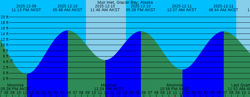 2025-12-09 09:28 PM AKST Moonrise 2025-12-09 11:13 PM AKST -0.27 feet Low Tide 2025-12-10 05:48 AM AKST 15.24 feet High Tide 2025-12-10 08:46 AM AKST Sunrise 2025-12-10 11:46 AM AKST 4.68 feet Low Tide 2025-12-10 12:24 PM AKST Moonset 2025-12-10 03:08 PM AKST Sunset 2025-12-10 05:29 PM AKST 14.97 feet High Tide 2025-12-10 10:58 PM AKST Moonrise 2025-12-11 12:07 AM AKST 1.26 feet Low Tide 2025-12-11 06:44 AM AKST 14.91 feet High Tide 2025-12-11 08:47 AM AKST Sunrise 2025-12-11 11:52 AM AKST Last Quarter 2025-12-11 12:25 PM AKST Moonset 2025-12-11 12:55 PM AKST 4.83 feet Low Tide 2025-12-11 03:07 PM AKST Sunset 2025-12-11 06:37 PM AKST 13.48 feet High Tide 2025-12-12 12:23 AM AKST Moonrise 2025-12-12 01:05 AM AKST 2.69 feet Low Tide 2025-12-12 07:41 AM AKST 14.82 feet High Tide 2025-12-12 08:49 AM AKST Sunrise 2025-12-12 12:26 PM AKST Moonset 2025-12-12 02:08 PM AKST 4.53 feet Low Tide 2025-12-12 03:07 PM AKST Sunset 2025-12-12 07:54 PM AKST 12.49 feet High Tide 2025-12-13 01:45 AM AKST Moonrise 2025-12-13 02:06 AM AKST 3.87 feet Low Tide 2025-12-13 08:35 AM AKST 14.97 feet High Tide 2025-12-13 08:50 AM AKST Sunrise 2025-12-13 12:26 PM AKST Moonset 2025-12-13 03:07 PM AKST Sunset 2025-12-13 03:16 PM AKST 3.81 feet Low Tide |