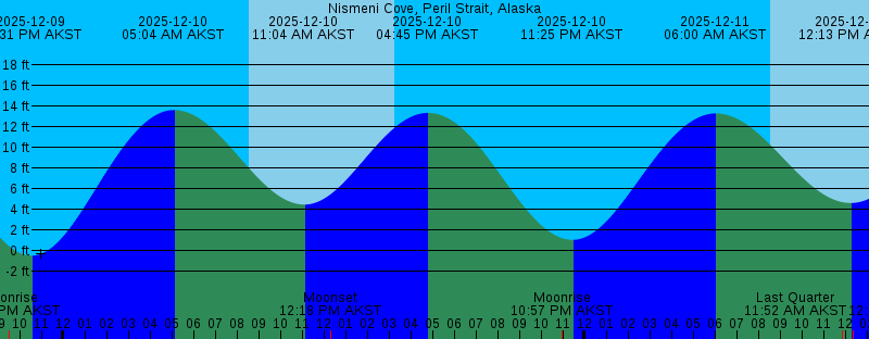 2025-12-09 10:31 PM AKST -0.47 feet Low Tide 2025-12-10 05:04 AM AKST 13.64 feet High Tide 2025-12-10 08:33 AM AKST Sunrise 2025-12-10 11:04 AM AKST 4.48 feet Low Tide 2025-12-10 12:18 PM AKST Moonset 2025-12-10 03:15 PM AKST Sunset 2025-12-10 04:45 PM AKST 13.37 feet High Tide 2025-12-10 10:57 PM AKST Moonrise 2025-12-10 11:25 PM AKST 1.06 feet Low Tide 2025-12-11 06:00 AM AKST 13.31 feet High Tide 2025-12-11 08:34 AM AKST Sunrise 2025-12-11 11:52 AM AKST Last Quarter 2025-12-11 12:13 PM AKST 4.63 feet Low Tide 2025-12-11 12:21 PM AKST Moonset 2025-12-11 03:15 PM AKST Sunset 2025-12-11 05:53 PM AKST 11.88 feet High Tide 2025-12-12 12:20 AM AKST Moonrise 2025-12-12 12:23 AM AKST 2.49 feet Low Tide 2025-12-12 06:57 AM AKST 13.22 feet High Tide 2025-12-12 08:35 AM AKST Sunrise 2025-12-12 12:24 PM AKST Moonset 2025-12-12 01:26 PM AKST 4.33 feet Low Tide 2025-12-12 03:15 PM AKST Sunset 2025-12-12 07:10 PM AKST 10.89 feet High Tide 2025-12-13 01:24 AM AKST 3.67 feet Low Tide 2025-12-13 01:41 AM AKST Moonrise 2025-12-13 07:51 AM AKST 13.37 feet High Tide 2025-12-13 08:36 AM AKST Sunrise 2025-12-13 12:27 PM AKST Moonset 2025-12-13 02:34 PM AKST 3.61 feet Low Tide 2025-12-13 03:15 PM AKST Sunset 2025-12-13 08:28 PM AKST 10.59 feet High Tide |