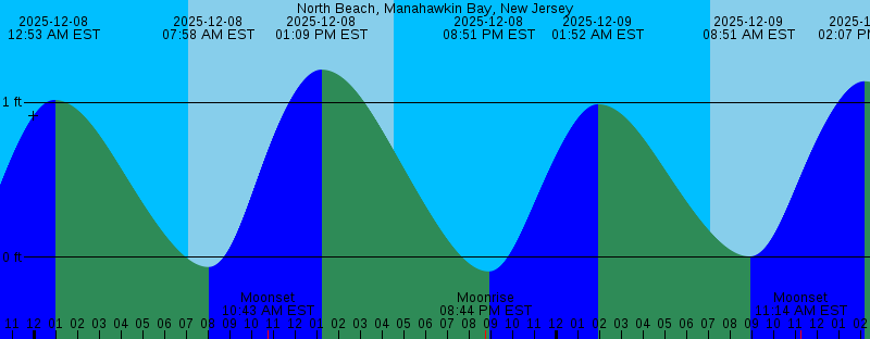 2025-12-07 04:32 PM EST Sunset 2025-12-07 07:29 PM EST Moonrise 2025-12-07 08:00 PM EST -0.14 feet Low Tide 2025-12-08 12:53 AM EST 1.02 feet High Tide 2025-12-08 07:05 AM EST Sunrise 2025-12-08 07:58 AM EST -0.06 feet Low Tide 2025-12-08 10:43 AM EST Moonset 2025-12-08 01:09 PM EST 1.21 feet High Tide 2025-12-08 04:32 PM EST Sunset 2025-12-08 08:44 PM EST Moonrise 2025-12-08 08:51 PM EST -0.09 feet Low Tide 2025-12-09 01:52 AM EST 0.99 feet High Tide 2025-12-09 07:05 AM EST Sunrise 2025-12-09 08:51 AM EST 0.01 feet Low Tide 2025-12-09 11:14 AM EST Moonset 2025-12-09 02:07 PM EST 1.14 feet High Tide 2025-12-09 04:32 PM EST Sunset 2025-12-09 09:44 PM EST -0.04 feet Low Tide 2025-12-09 09:55 PM EST Moonrise 2025-12-10 02:51 AM EST 0.97 feet High Tide 2025-12-10 07:06 AM EST Sunrise 2025-12-10 09:48 AM EST 0.08 feet Low Tide 2025-12-10 11:40 AM EST Moonset 2025-12-10 03:03 PM EST 1.06 feet High Tide 2025-12-10 04:32 PM EST Sunset 2025-12-10 10:40 PM EST 0.01 feet Low Tide 2025-12-10 11:02 PM EST Moonrise 2025-12-11 03:46 AM EST 0.96 feet High Tide 2025-12-11 07:07 AM EST Sunrise 2025-12-11 10:51 AM EST 0.14 feet Low Tide 2025-12-11 12:03 PM EST Moonset |