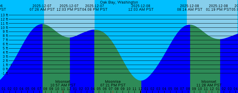 2025-12-06 11:14 PM PST -3.41 feet Low Tide 2025-12-07 07:26 AM PST 10.85 feet High Tide 2025-12-07 07:47 AM PST Sunrise 2025-12-07 10:57 AM PST Moonset 2025-12-07 12:03 PM PST 7.62 feet Low Tide 2025-12-07 04:08 PM PST 9.50 feet High Tide 2025-12-07 04:17 PM PST Sunset 2025-12-07 07:21 PM PST Moonrise 2025-12-08 12:03 AM PST -2.76 feet Low Tide 2025-12-08 07:48 AM PST Sunrise 2025-12-08 08:14 AM PST 10.71 feet High Tide 2025-12-08 11:28 AM PST Moonset 2025-12-08 01:19 PM PST 7.21 feet Low Tide 2025-12-08 04:17 PM PST Sunset 2025-12-08 05:08 PM PST 8.76 feet High Tide 2025-12-08 08:44 PM PST Moonrise 2025-12-09 12:52 AM PST -1.81 feet Low Tide 2025-12-09 07:49 AM PST Sunrise 2025-12-09 08:59 AM PST 10.52 feet High Tide 2025-12-09 11:51 AM PST Moonset 2025-12-09 03:00 PM PST 6.51 feet Low Tide 2025-12-09 04:17 PM PST Sunset 2025-12-09 06:16 PM PST 7.86 feet High Tide 2025-12-09 10:03 PM PST Moonrise 2025-12-10 01:43 AM PST -0.61 feet Low Tide 2025-12-10 07:50 AM PST Sunrise 2025-12-10 09:42 AM PST 10.33 feet High Tide 2025-12-10 12:09 PM PST Moonset 2025-12-10 04:17 PM PST Sunset 2025-12-10 04:39 PM PST 5.48 feet Low Tide 2025-12-10 07:35 PM PST 6.90 feet High Tide |
