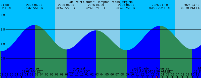 2026-04-09 02:08 AM EDT Moonrise 2026-04-09 02:32 AM EDT 2.32 feet High Tide 2026-04-09 06:39 AM EDT Sunrise 2026-04-09 08:52 AM EDT 0.63 feet Low Tide 2026-04-09 11:24 AM EDT Moonset 2026-04-09 02:48 PM EDT 1.95 feet High Tide 2026-04-09 07:34 PM EDT Sunset 2026-04-09 08:49 PM EDT 0.57 feet Low Tide 2026-04-10 12:55 AM EDT Last Quarter 2026-04-10 02:50 AM EDT Moonrise 2026-04-10 03:30 AM EDT 2.26 feet High Tide 2026-04-10 06:37 AM EDT Sunrise 2026-04-10 09:50 AM EDT 0.65 feet Low Tide 2026-04-10 12:25 PM EDT Moonset 2026-04-10 03:49 PM EDT 1.96 feet High Tide 2026-04-10 07:35 PM EDT Sunset 2026-04-10 09:53 PM EDT 0.59 feet Low Tide 2026-04-11 03:26 AM EDT Moonrise 2026-04-11 04:32 AM EDT 2.26 feet High Tide 2026-04-11 06:36 AM EDT Sunrise 2026-04-11 10:47 AM EDT 0.59 feet Low Tide 2026-04-11 01:28 PM EDT Moonset 2026-04-11 04:53 PM EDT 2.06 feet High Tide 2026-04-11 07:36 PM EDT Sunset 2026-04-11 10:59 PM EDT 0.53 feet Low Tide 2026-04-12 03:57 AM EDT Moonrise 2026-04-12 05:32 AM EDT 2.30 feet High Tide 2026-04-12 06:35 AM EDT Sunrise 2026-04-12 11:41 AM EDT 0.48 feet Low Tide 2026-04-12 02:33 PM EDT Moonset 2026-04-12 05:53 PM EDT 2.23 feet High Tide 2026-04-12 07:37 PM EDT Sunset |