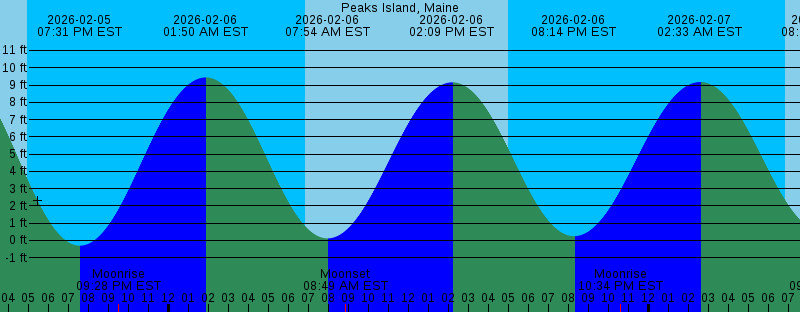2026-02-05 04:57 PM EST Sunset 2026-02-05 07:32 PM EST -0.31 feet Low Tide 2026-02-05 09:28 PM EST Moonrise 2026-02-06 01:50 AM EST 9.44 feet High Tide 2026-02-06 06:51 AM EST Sunrise 2026-02-06 07:54 AM EST 0.12 feet Low Tide 2026-02-06 08:49 AM EST Moonset 2026-02-06 02:09 PM EST 9.15 feet High Tide 2026-02-06 04:58 PM EST Sunset 2026-02-06 08:14 PM EST 0.24 feet Low Tide 2026-02-06 10:34 PM EST Moonrise 2026-02-07 02:33 AM EST 9.17 feet High Tide 2026-02-07 06:50 AM EST Sunrise 2026-02-07 08:43 AM EST 0.48 feet Low Tide 2026-02-07 09:09 AM EST Moonset 2026-02-07 02:57 PM EST 8.53 feet High Tide 2026-02-07 05:00 PM EST Sunset 2026-02-07 08:58 PM EST 0.82 feet Low Tide 2026-02-07 11:40 PM EST Moonrise 2026-02-08 03:18 AM EST 8.86 feet High Tide 2026-02-08 06:48 AM EST Sunrise 2026-02-08 09:31 AM EST Moonset 2026-02-08 09:34 AM EST 0.86 feet Low Tide 2026-02-08 03:48 PM EST 7.94 feet High Tide 2026-02-08 05:01 PM EST Sunset 2026-02-08 09:45 PM EST 1.36 feet Low Tide 2026-02-09 12:46 AM EST Moonrise 2026-02-09 04:06 AM EST 8.56 feet High Tide 2026-02-09 06:47 AM EST Sunrise 2026-02-09 07:44 AM EST Last Quarter 2026-02-09 09:57 AM EST Moonset 2026-02-09 10:30 AM EST 1.18 feet Low Tide |