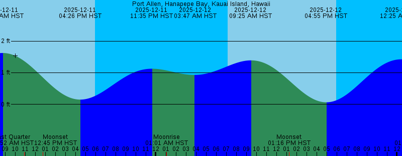 2025-12-11 10:52 AM HST Last Quarter 2025-12-11 12:45 PM HST Moonset 2025-12-11 04:26 PM HST 0.15 feet Low Tide 2025-12-11 05:56 PM HST Sunset 2025-12-11 11:35 PM HST 1.13 feet High Tide 2025-12-12 01:01 AM HST Moonrise 2025-12-12 03:47 AM HST 0.93 feet Low Tide 2025-12-12 07:07 AM HST Sunrise 2025-12-12 09:25 AM HST 1.39 feet High Tide 2025-12-12 01:16 PM HST Moonset 2025-12-12 04:55 PM HST 0.06 feet Low Tide 2025-12-12 05:56 PM HST Sunset 2025-12-13 12:25 AM HST 1.43 feet High Tide 2025-12-13 01:52 AM HST Moonrise 2025-12-13 05:56 AM HST 0.95 feet Low Tide 2025-12-13 07:08 AM HST Sunrise 2025-12-13 10:08 AM HST 1.18 feet High Tide 2025-12-13 01:46 PM HST Moonset 2025-12-13 05:21 PM HST -0.02 feet Low Tide 2025-12-13 05:57 PM HST Sunset 2025-12-14 01:01 AM HST 1.70 feet High Tide 2025-12-14 02:42 AM HST Moonrise 2025-12-14 07:09 AM HST Sunrise 2025-12-14 07:33 AM HST 0.86 feet Low Tide 2025-12-14 10:51 AM HST 0.98 feet High Tide 2025-12-14 02:18 PM HST Moonset 2025-12-14 05:46 PM HST -0.08 feet Low Tide 2025-12-14 05:57 PM HST Sunset 2025-12-15 01:33 AM HST 1.93 feet High Tide 2025-12-15 03:33 AM HST Moonrise 2025-12-15 07:09 AM HST Sunrise 2025-12-15 08:40 AM HST 0.73 feet Low Tide |