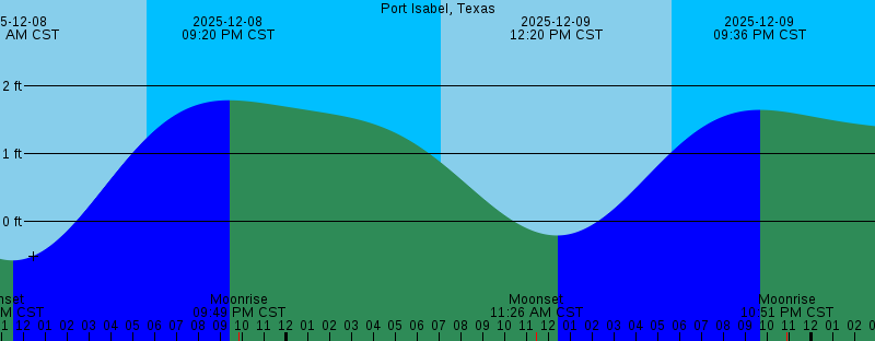 2025-12-08 10:46 AM CST Moonset 2025-12-08 11:27 AM CST -0.58 feet Low Tide 2025-12-08 05:37 PM CST Sunset 2025-12-08 09:20 PM CST 1.79 feet High Tide 2025-12-08 09:49 PM CST Moonrise 2025-12-09 07:04 AM CST Sunrise 2025-12-09 11:26 AM CST Moonset 2025-12-09 12:20 PM CST -0.21 feet Low Tide 2025-12-09 05:37 PM CST Sunset 2025-12-09 09:36 PM CST 1.65 feet High Tide 2025-12-09 10:51 PM CST Moonrise 2025-12-10 07:05 AM CST Sunrise 2025-12-10 12:00 PM CST Moonset 2025-12-10 01:13 PM CST 0.20 feet Low Tide 2025-12-10 05:38 PM CST Sunset 2025-12-10 09:38 PM CST 1.50 feet High Tide 2025-12-10 11:48 PM CST Moonrise 2025-12-11 07:06 AM CST Sunrise 2025-12-11 12:31 PM CST Moonset 2025-12-11 02:06 PM CST 0.60 feet Low Tide 2025-12-11 02:52 PM CST Last Quarter 2025-12-11 05:38 PM CST Sunset 2025-12-11 09:31 PM CST 1.38 feet High Tide 2025-12-12 12:43 AM CST Moonrise 2025-12-12 04:35 AM CST 0.94 feet Low Tide 2025-12-12 07:06 AM CST Sunrise 2025-12-12 09:36 AM CST 1.07 feet High Tide |