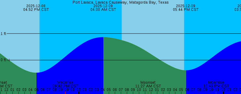 2025-12-08 10:49 AM CST Moonset 2025-12-08 04:52 PM CST -0.48 feet Low Tide 2025-12-08 05:29 PM CST Sunset 2025-12-08 09:42 PM CST Moonrise 2025-12-09 04:00 AM CST 0.87 feet High Tide 2025-12-09 07:08 AM CST Sunrise 2025-12-09 11:27 AM CST Moonset 2025-12-09 05:29 PM CST Sunset 2025-12-09 05:44 PM CST -0.39 feet Low Tide 2025-12-09 10:45 PM CST Moonrise 2025-12-10 03:56 AM CST 0.73 feet High Tide 2025-12-10 07:08 AM CST Sunrise 2025-12-10 12:00 PM CST Moonset 2025-12-10 05:30 PM CST Sunset 2025-12-10 06:31 PM CST -0.23 feet Low Tide 2025-12-10 11:44 PM CST Moonrise 2025-12-11 03:36 AM CST 0.60 feet High Tide 2025-12-11 07:09 AM CST Sunrise 2025-12-11 12:29 PM CST Moonset 2025-12-11 02:52 PM CST Last Quarter 2025-12-11 05:30 PM CST Sunset 2025-12-11 07:14 PM CST -0.02 feet Low Tide 2025-12-12 12:40 AM CST Moonrise 2025-12-12 03:02 AM CST 0.49 feet High Tide 2025-12-12 07:10 AM CST Sunrise 2025-12-12 10:07 AM CST 0.07 feet Low Tide |