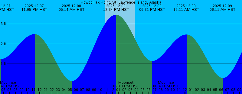 Note: Reference is in time zone :America/Anchorage; adjusted offsets 1 hr to undo LST compensation. 2025-12-07 10:48 AM HST Sunrise 2025-12-07 11:40 AM HST 3.49 feet High Tide 2025-12-07 02:27 PM HST Moonset 2025-12-07 03:44 PM HST Sunset 2025-12-07 05:34 PM HST 1.24 feet Low Tide 2025-12-07 06:41 PM HST Moonrise 2025-12-07 11:05 PM HST 2.49 feet High Tide 2025-12-08 05:14 AM HST 0.14 feet Low Tide 2025-12-08 10:50 AM HST Sunrise 2025-12-08 12:34 PM HST 3.46 feet High Tide 2025-12-08 02:13 PM HST Moonset 2025-12-08 03:43 PM HST Sunset 2025-12-08 06:31 PM HST 1.14 feet Low Tide 2025-12-08 08:48 PM HST Moonrise 2025-12-09 12:11 AM HST 2.47 feet High Tide 2025-12-09 06:11 AM HST 0.29 feet Low Tide 2025-12-09 10:52 AM HST Sunrise 2025-12-09 01:26 PM HST 3.40 feet High Tide 2025-12-09 02:04 PM HST Moonset 2025-12-09 03:42 PM HST Sunset 2025-12-09 07:26 PM HST 1.02 feet Low Tide 2025-12-09 10:39 PM HST Moonrise 2025-12-10 01:19 AM HST 2.47 feet High Tide 2025-12-10 07:09 AM HST 0.48 feet Low Tide 2025-12-10 10:54 AM HST Sunrise 2025-12-10 01:56 PM HST Moonset 2025-12-10 02:16 PM HST 3.30 feet High Tide 2025-12-10 03:41 PM HST Sunset 2025-12-10 08:20 PM HST 0.90 feet Low Tide 2025-12-11 12:19 AM HST Moonrise 2025-12-11 02:28 AM HST 2.48 feet High Tide |