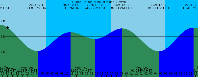 2025-12-11 10:52 AM HST Last Quarter 2025-12-11 12:33 PM HST Moonset 2025-12-11 04:01 PM HST 0.06 feet Low Tide 2025-12-11 05:46 PM HST Sunset 2025-12-11 10:41 PM HST 1.28 feet High Tide 2025-12-12 12:50 AM HST Moonrise 2025-12-12 03:38 AM HST 0.84 feet Low Tide 2025-12-12 06:55 AM HST Sunrise 2025-12-12 09:04 AM HST 1.53 feet High Tide 2025-12-12 01:04 PM HST Moonset 2025-12-12 04:31 PM HST 0.04 feet Low Tide 2025-12-12 05:47 PM HST Sunset 2025-12-12 11:31 PM HST 1.57 feet High Tide 2025-12-13 01:40 AM HST Moonrise 2025-12-13 05:29 AM HST 0.85 feet Low Tide 2025-12-13 06:55 AM HST Sunrise 2025-12-13 09:52 AM HST 1.30 feet High Tide 2025-12-13 01:36 PM HST Moonset 2025-12-13 04:59 PM HST 0.02 feet Low Tide 2025-12-13 05:47 PM HST Sunset 2025-12-14 12:10 AM HST 1.83 feet High Tide 2025-12-14 02:30 AM HST Moonrise 2025-12-14 06:56 AM HST Sunrise 2025-12-14 06:57 AM HST 0.75 feet Low Tide 2025-12-14 10:42 AM HST 1.10 feet High Tide 2025-12-14 02:08 PM HST Moonset 2025-12-14 05:24 PM HST -0.00 feet Low Tide 2025-12-14 05:48 PM HST Sunset 2025-12-15 12:44 AM HST 2.05 feet High Tide 2025-12-15 03:20 AM HST Moonrise 2025-12-15 06:56 AM HST Sunrise 2025-12-15 08:01 AM HST 0.62 feet Low Tide |