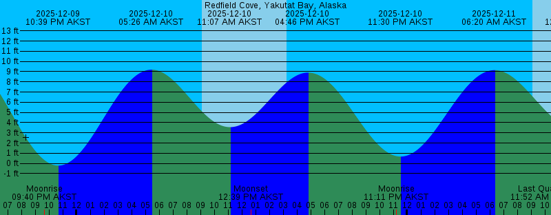 2025-12-09 09:40 PM AKST Moonrise 2025-12-09 10:39 PM AKST -0.21 feet Low Tide 2025-12-10 05:26 AM AKST 9.19 feet High Tide 2025-12-10 09:06 AM AKST Sunrise 2025-12-10 11:07 AM AKST 3.56 feet Low Tide 2025-12-10 12:39 PM AKST Moonset 2025-12-10 03:16 PM AKST Sunset 2025-12-10 04:46 PM AKST 8.90 feet High Tide 2025-12-10 11:11 PM AKST Moonrise 2025-12-10 11:30 PM AKST 0.67 feet Low Tide 2025-12-11 06:20 AM AKST 9.15 feet High Tide 2025-12-11 09:07 AM AKST Sunrise 2025-12-11 11:52 AM AKST Last Quarter 2025-12-11 12:22 PM AKST 3.36 feet Low Tide 2025-12-11 12:39 PM AKST Moonset 2025-12-11 03:15 PM AKST Sunset 2025-12-11 05:57 PM AKST 7.85 feet High Tide 2025-12-12 12:23 AM AKST 1.55 feet Low Tide 2025-12-12 12:38 AM AKST Moonrise 2025-12-12 07:13 AM AKST 9.21 feet High Tide 2025-12-12 09:09 AM AKST Sunrise 2025-12-12 12:39 PM AKST Moonset 2025-12-12 01:40 PM AKST 2.92 feet Low Tide 2025-12-12 03:15 PM AKST Sunset 2025-12-12 07:20 PM AKST 7.14 feet High Tide 2025-12-13 01:18 AM AKST 2.37 feet Low Tide 2025-12-13 02:01 AM AKST Moonrise 2025-12-13 08:02 AM AKST 9.37 feet High Tide 2025-12-13 09:10 AM AKST Sunrise 2025-12-13 12:39 PM AKST Moonset 2025-12-13 02:49 PM AKST 2.29 feet Low Tide 2025-12-13 03:15 PM AKST Sunset |