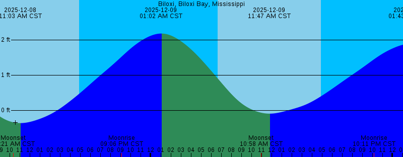2025-12-07 07:58 PM CST Moonrise 2025-12-08 12:14 AM CST 2.41 feet High Tide 2025-12-08 06:40 AM CST Sunrise 2025-12-08 10:21 AM CST Moonset 2025-12-08 11:03 AM CST -0.36 feet Low Tide 2025-12-08 04:54 PM CST Sunset 2025-12-08 09:06 PM CST Moonrise 2025-12-09 01:02 AM CST 2.18 feet High Tide 2025-12-09 06:41 AM CST Sunrise 2025-12-09 10:58 AM CST Moonset 2025-12-09 11:47 AM CST -0.09 feet Low Tide 2025-12-09 04:55 PM CST Sunset 2025-12-09 10:11 PM CST Moonrise 2025-12-10 01:43 AM CST 1.89 feet High Tide 2025-12-10 06:41 AM CST Sunrise 2025-12-10 11:30 AM CST Moonset 2025-12-10 12:13 PM CST 0.20 feet Low Tide 2025-12-10 04:55 PM CST Sunset 2025-12-10 11:11 PM CST Moonrise 2025-12-11 02:15 AM CST 1.55 feet High Tide 2025-12-11 06:42 AM CST Sunrise 2025-12-11 11:59 AM CST Moonset 2025-12-11 12:11 PM CST 0.48 feet Low Tide 2025-12-11 02:52 PM CST Last Quarter 2025-12-11 04:55 PM CST Sunset |
