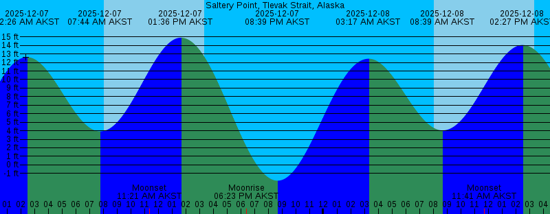 2025-12-07 02:26 AM AKST 12.62 feet High Tide 2025-12-07 07:44 AM AKST 3.92 feet Low Tide 2025-12-07 08:02 AM AKST Sunrise 2025-12-07 11:21 AM AKST Moonset 2025-12-07 01:36 PM AKST 14.91 feet High Tide 2025-12-07 03:22 PM AKST Sunset 2025-12-07 06:23 PM AKST Moonrise 2025-12-07 08:39 PM AKST -1.85 feet Low Tide 2025-12-08 03:17 AM AKST 12.44 feet High Tide 2025-12-08 08:04 AM AKST Sunrise 2025-12-08 08:39 AM AKST 4.04 feet Low Tide 2025-12-08 11:41 AM AKST Moonset 2025-12-08 02:27 PM AKST 14.05 feet High Tide 2025-12-08 03:22 PM AKST Sunset 2025-12-08 07:58 PM AKST Moonrise 2025-12-08 09:28 PM AKST -1.08 feet Low Tide 2025-12-09 04:09 AM AKST 12.24 feet High Tide 2025-12-09 08:05 AM AKST Sunrise 2025-12-09 09:39 AM AKST 4.14 feet Low Tide 2025-12-09 11:53 AM AKST Moonset 2025-12-09 03:22 PM AKST Sunset 2025-12-09 03:22 PM AKST 12.97 feet High Tide 2025-12-09 09:27 PM AKST Moonrise 2025-12-09 10:18 PM AKST -0.14 feet Low Tide 2025-12-10 05:02 AM AKST 12.09 feet High Tide 2025-12-10 08:06 AM AKST Sunrise 2025-12-10 10:46 AM AKST 4.14 feet Low Tide 2025-12-10 12:02 PM AKST Moonset 2025-12-10 03:21 PM AKST Sunset 2025-12-10 04:22 PM AKST 11.80 feet High Tide |