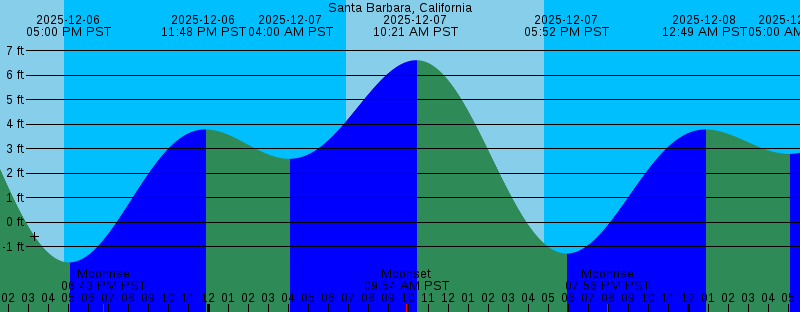 2025-12-06 04:48 PM PST Sunset 2025-12-06 05:00 PM PST -1.64 feet Low Tide 2025-12-06 06:43 PM PST Moonrise 2025-12-06 11:48 PM PST 3.78 feet High Tide 2025-12-07 04:00 AM PST 2.58 feet Low Tide 2025-12-07 06:52 AM PST Sunrise 2025-12-07 09:54 AM PST Moonset 2025-12-07 10:21 AM PST 6.61 feet High Tide 2025-12-07 04:48 PM PST Sunset 2025-12-07 05:52 PM PST -1.28 feet Low Tide 2025-12-07 07:56 PM PST Moonrise 2025-12-08 12:49 AM PST 3.78 feet High Tide 2025-12-08 05:00 AM PST 2.78 feet Low Tide 2025-12-08 06:53 AM PST Sunrise 2025-12-08 10:36 AM PST Moonset 2025-12-08 11:14 AM PST 6.02 feet High Tide 2025-12-08 04:48 PM PST Sunset 2025-12-08 06:46 PM PST -0.80 feet Low Tide 2025-12-08 09:07 PM PST Moonrise 2025-12-09 01:52 AM PST 3.87 feet High Tide 2025-12-09 06:13 AM PST 2.94 feet Low Tide 2025-12-09 06:53 AM PST Sunrise 2025-12-09 11:11 AM PST Moonset 2025-12-09 12:12 PM PST 5.32 feet High Tide 2025-12-09 04:48 PM PST Sunset 2025-12-09 07:41 PM PST -0.27 feet Low Tide 2025-12-09 10:14 PM PST Moonrise 2025-12-10 02:55 AM PST 4.07 feet High Tide 2025-12-10 06:54 AM PST Sunrise 2025-12-10 07:46 AM PST 2.94 feet Low Tide 2025-12-10 11:39 AM PST Moonset 2025-12-10 01:20 PM PST 4.58 feet High Tide |