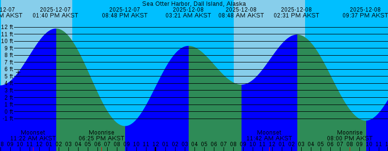 2025-12-07 02:30 AM AKST 9.52 feet High Tide 2025-12-07 07:53 AM AKST 3.72 feet Low Tide 2025-12-07 08:03 AM AKST Sunrise 2025-12-07 11:22 AM AKST Moonset 2025-12-07 01:40 PM AKST 11.81 feet High Tide 2025-12-07 03:24 PM AKST Sunset 2025-12-07 06:25 PM AKST Moonrise 2025-12-07 08:48 PM AKST -2.05 feet Low Tide 2025-12-08 03:21 AM AKST 9.34 feet High Tide 2025-12-08 08:05 AM AKST Sunrise 2025-12-08 08:48 AM AKST 3.84 feet Low Tide 2025-12-08 11:42 AM AKST Moonset 2025-12-08 02:31 PM AKST 10.95 feet High Tide 2025-12-08 03:24 PM AKST Sunset 2025-12-08 08:00 PM AKST Moonrise 2025-12-08 09:37 PM AKST -1.28 feet Low Tide 2025-12-09 04:13 AM AKST 9.14 feet High Tide 2025-12-09 08:06 AM AKST Sunrise 2025-12-09 09:48 AM AKST 3.94 feet Low Tide 2025-12-09 11:54 AM AKST Moonset 2025-12-09 03:24 PM AKST Sunset 2025-12-09 03:26 PM AKST 9.87 feet High Tide 2025-12-09 09:29 PM AKST Moonrise 2025-12-09 10:27 PM AKST -0.34 feet Low Tide 2025-12-10 05:06 AM AKST 8.99 feet High Tide 2025-12-10 08:07 AM AKST Sunrise 2025-12-10 10:55 AM AKST 3.94 feet Low Tide 2025-12-10 12:03 PM AKST Moonset 2025-12-10 03:23 PM AKST Sunset 2025-12-10 04:26 PM AKST 8.70 feet High Tide 2025-12-10 10:52 PM AKST Moonrise 2025-12-10 11:18 PM AKST 0.66 feet Low Tide |