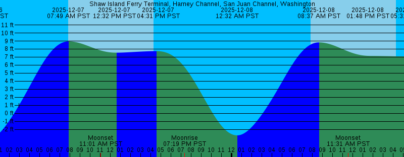 2025-12-06 11:42 PM PST -3.38 feet Low Tide 2025-12-07 07:49 AM PST 8.95 feet High Tide 2025-12-07 07:50 AM PST Sunrise 2025-12-07 11:01 AM PST Moonset 2025-12-07 12:32 PM PST 7.55 feet Low Tide 2025-12-07 04:16 PM PST Sunset 2025-12-07 04:31 PM PST 7.74 feet High Tide 2025-12-07 07:19 PM PST Moonrise 2025-12-08 12:32 AM PST -2.74 feet Low Tide 2025-12-08 07:51 AM PST Sunrise 2025-12-08 08:37 AM PST 8.83 feet High Tide 2025-12-08 11:31 AM PST Moonset 2025-12-08 01:48 PM PST 7.14 feet Low Tide 2025-12-08 04:16 PM PST Sunset 2025-12-08 05:31 PM PST 7.08 feet High Tide 2025-12-08 08:43 PM PST Moonrise 2025-12-09 01:21 AM PST -1.79 feet Low Tide 2025-12-09 07:52 AM PST Sunrise 2025-12-09 09:22 AM PST 8.66 feet High Tide 2025-12-09 11:53 AM PST Moonset 2025-12-09 03:29 PM PST 6.44 feet Low Tide 2025-12-09 04:16 PM PST Sunset 2025-12-09 06:39 PM PST 6.26 feet High Tide 2025-12-09 10:03 PM PST Moonrise 2025-12-10 02:12 AM PST -0.60 feet Low Tide 2025-12-10 07:53 AM PST Sunrise 2025-12-10 10:05 AM PST 8.49 feet High Tide 2025-12-10 12:10 PM PST Moonset 2025-12-10 04:15 PM PST Sunset 2025-12-10 05:08 PM PST 5.42 feet Low Tide 2025-12-10 07:58 PM PST 5.40 feet High Tide |