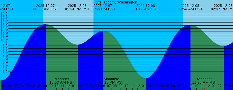 2025-12-07 12:28 AM PST -3.99 feet Low Tide 2025-12-07 07:43 AM PST Sunrise 2025-12-07 08:05 AM PST 15.46 feet High Tide 2025-12-07 10:53 AM PST Moonset 2025-12-07 01:34 PM PST 8.39 feet Low Tide 2025-12-07 04:20 PM PST Sunset 2025-12-07 05:55 PM PST 13.19 feet High Tide 2025-12-07 07:25 PM PST Moonrise 2025-12-08 01:17 AM PST -3.21 feet Low Tide 2025-12-08 07:44 AM PST Sunrise 2025-12-08 08:54 AM PST 15.27 feet High Tide 2025-12-08 11:25 AM PST Moonset 2025-12-08 02:37 PM PST 7.93 feet Low Tide 2025-12-08 04:20 PM PST Sunset 2025-12-08 06:54 PM PST 12.19 feet High Tide 2025-12-08 08:47 PM PST Moonrise 2025-12-09 02:06 AM PST -2.05 feet Low Tide 2025-12-09 07:45 AM PST Sunrise 2025-12-09 09:42 AM PST 15.01 feet High Tide 2025-12-09 11:48 AM PST Moonset 2025-12-09 03:46 PM PST 7.24 feet Low Tide 2025-12-09 04:20 PM PST Sunset 2025-12-09 08:00 PM PST 11.04 feet High Tide 2025-12-09 10:04 PM PST Moonrise 2025-12-10 02:57 AM PST -0.58 feet Low Tide 2025-12-10 07:46 AM PST Sunrise 2025-12-10 10:27 AM PST 14.75 feet High Tide 2025-12-10 12:07 PM PST Moonset 2025-12-10 04:20 PM PST Sunset 2025-12-10 04:58 PM PST 6.26 feet Low Tide 2025-12-10 09:16 PM PST 9.92 feet High Tide |