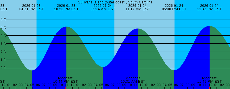 2026-01-23 04:51 PM EST -0.30 feet Low Tide 2026-01-23 05:43 PM EST Sunset 2026-01-23 10:44 PM EST Moonset 2026-01-23 10:53 PM EST 5.08 feet High Tide 2026-01-24 05:14 AM EST 0.13 feet Low Tide 2026-01-24 07:18 AM EST Sunrise 2026-01-24 10:31 AM EST Moonrise 2026-01-24 11:17 AM EST 4.85 feet High Tide 2026-01-24 05:38 PM EST -0.28 feet Low Tide 2026-01-24 05:44 PM EST Sunset 2026-01-24 11:46 PM EST 5.17 feet High Tide 2026-01-24 11:49 PM EST Moonset 2026-01-25 06:13 AM EST 0.30 feet Low Tide 2026-01-25 07:18 AM EST Sunrise 2026-01-25 11:02 AM EST Moonrise 2026-01-25 12:11 PM EST 4.60 feet High Tide 2026-01-25 05:45 PM EST Sunset 2026-01-25 06:31 PM EST -0.24 feet Low Tide 2026-01-25 11:48 PM EST First Quarter 2026-01-26 12:47 AM EST 5.24 feet High Tide 2026-01-26 12:56 AM EST Moonset 2026-01-26 07:17 AM EST Sunrise 2026-01-26 07:19 AM EST 0.43 feet Low Tide 2026-01-26 11:38 AM EST Moonrise 2026-01-26 01:14 PM EST 4.39 feet High Tide 2026-01-26 05:46 PM EST Sunset 2026-01-26 07:31 PM EST -0.22 feet Low Tide 2026-01-27 01:55 AM EST 5.31 feet High Tide 2026-01-27 02:07 AM EST Moonset 2026-01-27 07:17 AM EST Sunrise 2026-01-27 08:31 AM EST 0.44 feet Low Tide |