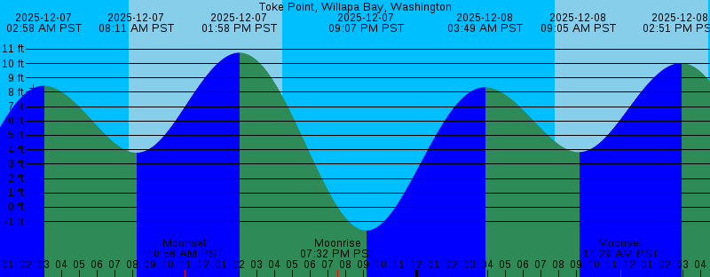 2025-12-07 02:58 AM PST 8.45 feet High Tide 2025-12-07 07:47 AM PST Sunrise 2025-12-07 08:11 AM PST 3.80 feet Low Tide 2025-12-07 10:56 AM PST Moonset 2025-12-07 01:58 PM PST 10.76 feet High Tide 2025-12-07 04:27 PM PST Sunset 2025-12-07 07:32 PM PST Moonrise 2025-12-07 09:07 PM PST -1.62 feet Low Tide 2025-12-08 03:49 AM PST 8.35 feet High Tide 2025-12-08 07:47 AM PST Sunrise 2025-12-08 09:05 AM PST 3.84 feet Low Tide 2025-12-08 11:29 AM PST Moonset 2025-12-08 02:51 PM PST 10.03 feet High Tide 2025-12-08 04:27 PM PST Sunset 2025-12-08 08:54 PM PST Moonrise 2025-12-08 09:56 PM PST -0.97 feet Low Tide 2025-12-09 04:41 AM PST 8.26 feet High Tide 2025-12-09 07:48 AM PST Sunrise 2025-12-09 10:04 AM PST 3.86 feet Low Tide 2025-12-09 11:53 AM PST Moonset 2025-12-09 03:48 PM PST 9.15 feet High Tide 2025-12-09 04:27 PM PST Sunset 2025-12-09 10:11 PM PST Moonrise 2025-12-09 10:45 PM PST -0.20 feet Low Tide 2025-12-10 05:33 AM PST 8.24 feet High Tide 2025-12-10 07:49 AM PST Sunrise 2025-12-10 11:10 AM PST 3.79 feet Low Tide 2025-12-10 12:12 PM PST Moonset 2025-12-10 04:27 PM PST Sunset 2025-12-10 04:50 PM PST 8.20 feet High Tide |