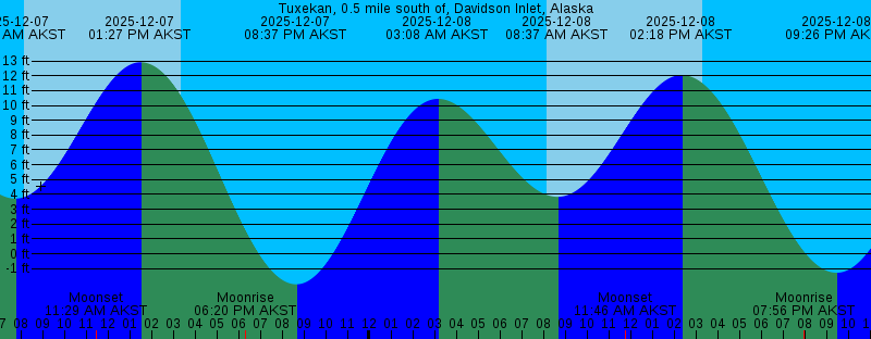 2025-12-07 02:17 AM AKST 10.62 feet High Tide 2025-12-07 07:42 AM AKST 3.72 feet Low Tide 2025-12-07 08:08 AM AKST Sunrise 2025-12-07 11:28 AM AKST Moonset 2025-12-07 01:27 PM AKST 12.91 feet High Tide 2025-12-07 03:20 PM AKST Sunset 2025-12-07 06:20 PM AKST Moonrise 2025-12-07 08:37 PM AKST -2.05 feet Low Tide 2025-12-08 03:08 AM AKST 10.44 feet High Tide 2025-12-08 08:10 AM AKST Sunrise 2025-12-08 08:37 AM AKST 3.84 feet Low Tide 2025-12-08 11:46 AM AKST Moonset 2025-12-08 02:18 PM AKST 12.05 feet High Tide 2025-12-08 03:19 PM AKST Sunset 2025-12-08 07:56 PM AKST Moonrise 2025-12-08 09:26 PM AKST -1.28 feet Low Tide 2025-12-09 04:00 AM AKST 10.24 feet High Tide 2025-12-09 08:11 AM AKST Sunrise 2025-12-09 09:37 AM AKST 3.94 feet Low Tide 2025-12-09 11:58 AM AKST Moonset 2025-12-09 03:13 PM AKST 10.97 feet High Tide 2025-12-09 03:19 PM AKST Sunset 2025-12-09 09:27 PM AKST Moonrise 2025-12-09 10:16 PM AKST -0.34 feet Low Tide 2025-12-10 04:53 AM AKST 10.09 feet High Tide 2025-12-10 08:12 AM AKST Sunrise 2025-12-10 10:44 AM AKST 3.94 feet Low Tide 2025-12-10 12:05 PM AKST Moonset 2025-12-10 03:19 PM AKST Sunset 2025-12-10 04:13 PM AKST 9.80 feet High Tide 2025-12-10 10:51 PM AKST Moonrise 2025-12-10 11:07 PM AKST 0.66 feet Low Tide |