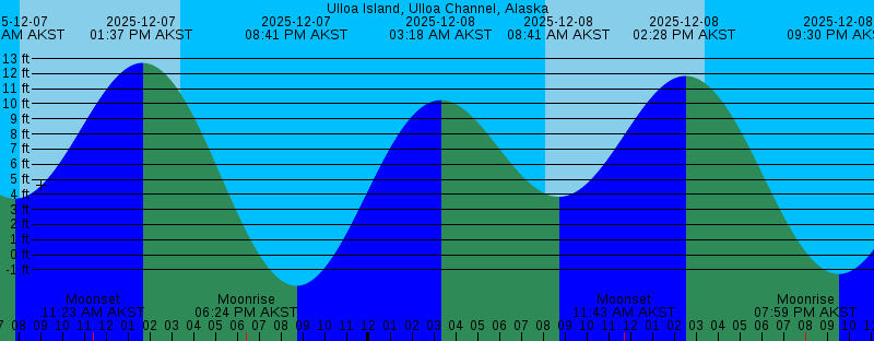 2025-12-07 02:27 AM AKST 10.42 feet High Tide 2025-12-07 07:46 AM AKST 3.72 feet Low Tide 2025-12-07 08:04 AM AKST Sunrise 2025-12-07 11:23 AM AKST Moonset 2025-12-07 01:37 PM AKST 12.71 feet High Tide 2025-12-07 03:23 PM AKST Sunset 2025-12-07 06:24 PM AKST Moonrise 2025-12-07 08:41 PM AKST -2.05 feet Low Tide 2025-12-08 03:18 AM AKST 10.24 feet High Tide 2025-12-08 08:05 AM AKST Sunrise 2025-12-08 08:41 AM AKST 3.84 feet Low Tide 2025-12-08 11:43 AM AKST Moonset 2025-12-08 02:28 PM AKST 11.85 feet High Tide 2025-12-08 03:23 PM AKST Sunset 2025-12-08 07:59 PM AKST Moonrise 2025-12-08 09:30 PM AKST -1.28 feet Low Tide 2025-12-09 04:10 AM AKST 10.04 feet High Tide 2025-12-09 08:07 AM AKST Sunrise 2025-12-09 09:41 AM AKST 3.94 feet Low Tide 2025-12-09 11:55 AM AKST Moonset 2025-12-09 03:23 PM AKST Sunset 2025-12-09 03:23 PM AKST 10.77 feet High Tide 2025-12-09 09:28 PM AKST Moonrise 2025-12-09 10:20 PM AKST -0.34 feet Low Tide 2025-12-10 05:03 AM AKST 9.89 feet High Tide 2025-12-10 08:08 AM AKST Sunrise 2025-12-10 10:48 AM AKST 3.94 feet Low Tide 2025-12-10 12:04 PM AKST Moonset 2025-12-10 03:22 PM AKST Sunset 2025-12-10 04:23 PM AKST 9.60 feet High Tide 2025-12-10 10:52 PM AKST Moonrise 2025-12-10 11:11 PM AKST 0.66 feet Low Tide |