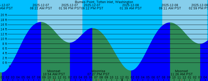 2025-12-07 12:50 AM PST -4.03 feet Low Tide 2025-12-07 07:44 AM PST Sunrise 2025-12-07 08:22 AM PST 17.14 feet High Tide 2025-12-07 10:54 AM PST Moonset 2025-12-07 01:56 PM PST 8.47 feet Low Tide 2025-12-07 04:22 PM PST Sunset 2025-12-07 06:12 PM PST 14.61 feet High Tide 2025-12-07 07:27 PM PST Moonrise 2025-12-08 01:39 AM PST -3.25 feet Low Tide 2025-12-08 07:45 AM PST Sunrise 2025-12-08 09:11 AM PST 16.93 feet High Tide 2025-12-08 11:26 AM PST Moonset 2025-12-08 02:59 PM PST 8.01 feet Low Tide 2025-12-08 04:22 PM PST Sunset 2025-12-08 07:11 PM PST 13.51 feet High Tide 2025-12-08 08:49 PM PST Moonrise 2025-12-09 02:28 AM PST -2.07 feet Low Tide 2025-12-09 07:46 AM PST Sunrise 2025-12-09 09:59 AM PST 16.64 feet High Tide 2025-12-09 11:50 AM PST Moonset 2025-12-09 04:08 PM PST 7.30 feet Low Tide 2025-12-09 04:22 PM PST Sunset 2025-12-09 08:17 PM PST 12.24 feet High Tide 2025-12-09 10:06 PM PST Moonrise 2025-12-10 03:19 AM PST -0.58 feet Low Tide 2025-12-10 07:47 AM PST Sunrise 2025-12-10 10:44 AM PST 16.34 feet High Tide 2025-12-10 12:08 PM PST Moonset 2025-12-10 04:22 PM PST Sunset 2025-12-10 05:20 PM PST 6.32 feet Low Tide 2025-12-10 09:33 PM PST 10.99 feet High Tide |