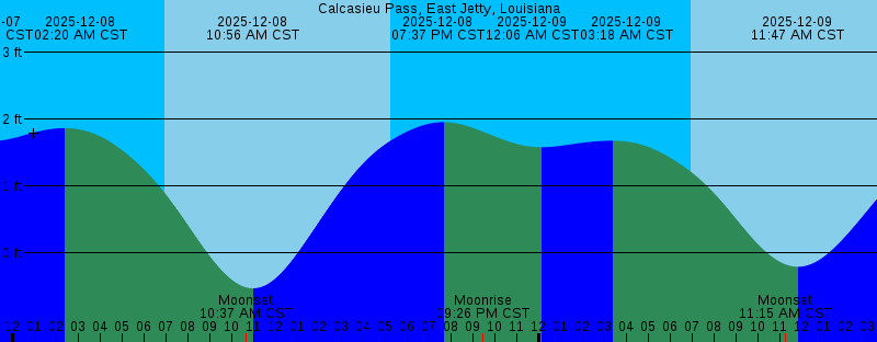 2025-12-07 05:13 PM CST Sunset 2025-12-07 06:45 PM CST 2.08 feet High Tide 2025-12-07 08:18 PM CST Moonrise 2025-12-07 11:04 PM CST 1.67 feet Low Tide 2025-12-08 02:20 AM CST 1.86 feet High Tide 2025-12-08 06:56 AM CST Sunrise 2025-12-08 10:37 AM CST Moonset 2025-12-08 10:56 AM CST -0.53 feet Low Tide 2025-12-08 05:14 PM CST Sunset 2025-12-08 07:37 PM CST 1.95 feet High Tide 2025-12-08 09:26 PM CST Moonrise 2025-12-09 12:06 AM CST 1.58 feet Low Tide 2025-12-09 03:18 AM CST 1.68 feet High Tide 2025-12-09 06:57 AM CST Sunrise 2025-12-09 11:15 AM CST Moonset 2025-12-09 11:47 AM CST -0.21 feet Low Tide 2025-12-09 05:14 PM CST Sunset 2025-12-09 08:21 PM CST 1.83 feet High Tide 2025-12-09 10:30 PM CST Moonrise 2025-12-10 01:57 AM CST 1.39 feet Low Tide 2025-12-10 04:51 AM CST 1.45 feet High Tide 2025-12-10 06:58 AM CST Sunrise 2025-12-10 11:48 AM CST Moonset 2025-12-10 12:46 PM CST 0.15 feet Low Tide 2025-12-10 05:14 PM CST Sunset 2025-12-10 08:55 PM CST 1.73 feet High Tide 2025-12-10 11:30 PM CST Moonrise 2025-12-11 03:18 AM CST 1.10 feet Low Tide 2025-12-11 06:58 AM CST Sunrise 2025-12-11 07:19 AM CST 1.26 feet High Tide 2025-12-11 12:16 PM CST Moonset |