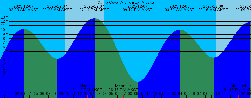 2025-12-07 03:03 AM AKST 10.27 feet High Tide 2025-12-07 08:23 AM AKST 3.25 feet Low Tide 2025-12-07 09:43 AM AKST Sunrise 2025-12-07 01:10 PM AKST Moonset 2025-12-07 02:19 PM AKST 12.76 feet High Tide 2025-12-07 03:57 PM AKST Sunset 2025-12-07 06:57 PM AKST Moonrise 2025-12-07 09:12 PM AKST -2.13 feet Low Tide 2025-12-08 03:53 AM AKST 10.05 feet High Tide 2025-12-08 09:16 AM AKST 3.50 feet Low Tide 2025-12-08 09:44 AM AKST Sunrise 2025-12-08 01:17 PM AKST Moonset 2025-12-08 03:09 PM AKST 11.86 feet High Tide 2025-12-08 03:57 PM AKST Sunset 2025-12-08 08:44 PM AKST Moonrise 2025-12-08 10:01 PM AKST -1.29 feet Low Tide 2025-12-09 04:46 AM AKST 9.79 feet High Tide 2025-12-09 09:46 AM AKST Sunrise 2025-12-09 10:12 AM AKST 3.77 feet Low Tide 2025-12-09 01:19 PM AKST Moonset 2025-12-09 03:56 PM AKST Sunset 2025-12-09 04:02 PM AKST 10.73 feet High Tide 2025-12-09 10:23 PM AKST Moonrise 2025-12-09 10:50 PM AKST -0.29 feet Low Tide 2025-12-10 05:42 AM AKST 9.60 feet High Tide 2025-12-10 09:47 AM AKST Sunrise 2025-12-10 11:12 AM AKST 3.98 feet Low Tide 2025-12-10 01:20 PM AKST Moonset 2025-12-10 03:56 PM AKST Sunset 2025-12-10 05:06 PM AKST 9.52 feet High Tide |