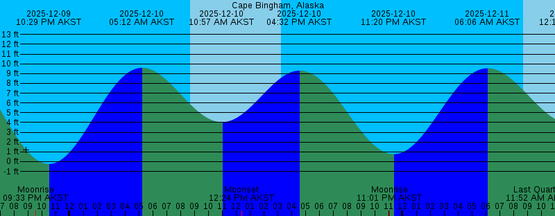 2025-12-09 09:33 PM AKST Moonrise 2025-12-09 10:29 PM AKST -0.24 feet Low Tide 2025-12-10 05:12 AM AKST 9.59 feet High Tide 2025-12-10 08:41 AM AKST Sunrise 2025-12-10 10:57 AM AKST 4.04 feet Low Tide 2025-12-10 12:24 PM AKST Moonset 2025-12-10 03:16 PM AKST Sunset 2025-12-10 04:32 PM AKST 9.30 feet High Tide 2025-12-10 11:01 PM AKST Moonrise 2025-12-10 11:20 PM AKST 0.76 feet Low Tide 2025-12-11 06:06 AM AKST 9.55 feet High Tide 2025-12-11 08:43 AM AKST Sunrise 2025-12-11 11:52 AM AKST Last Quarter 2025-12-11 12:12 PM AKST 3.82 feet Low Tide 2025-12-11 12:26 PM AKST Moonset 2025-12-11 03:16 PM AKST Sunset 2025-12-11 05:43 PM AKST 8.25 feet High Tide 2025-12-12 12:13 AM AKST 1.77 feet Low Tide 2025-12-12 12:25 AM AKST Moonrise 2025-12-12 06:59 AM AKST 9.61 feet High Tide 2025-12-12 08:44 AM AKST Sunrise 2025-12-12 12:28 PM AKST Moonset 2025-12-12 01:30 PM AKST 3.31 feet Low Tide 2025-12-12 03:16 PM AKST Sunset 2025-12-12 07:06 PM AKST 7.54 feet High Tide 2025-12-13 01:08 AM AKST 2.70 feet Low Tide 2025-12-13 01:46 AM AKST Moonrise 2025-12-13 07:48 AM AKST 9.77 feet High Tide 2025-12-13 08:45 AM AKST Sunrise 2025-12-13 12:30 PM AKST Moonset 2025-12-13 02:39 PM AKST 2.60 feet Low Tide 2025-12-13 03:15 PM AKST Sunset |